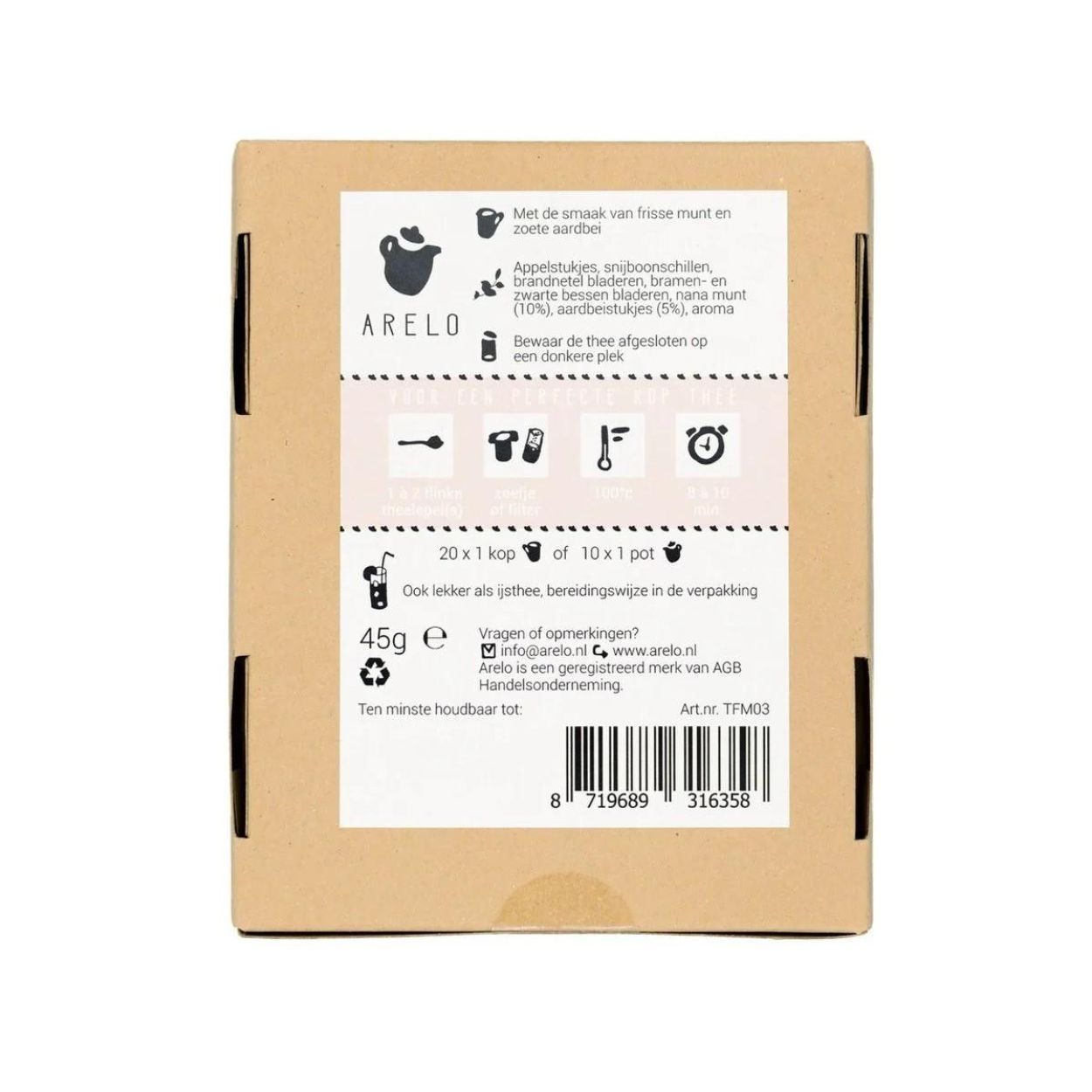 Morceaux de pomme, pelures de haricot, feuilles d’ortie, feuilles de mûre et de cassis, menthe nana (10 %), morceaux de fraise (5 %), arôme.