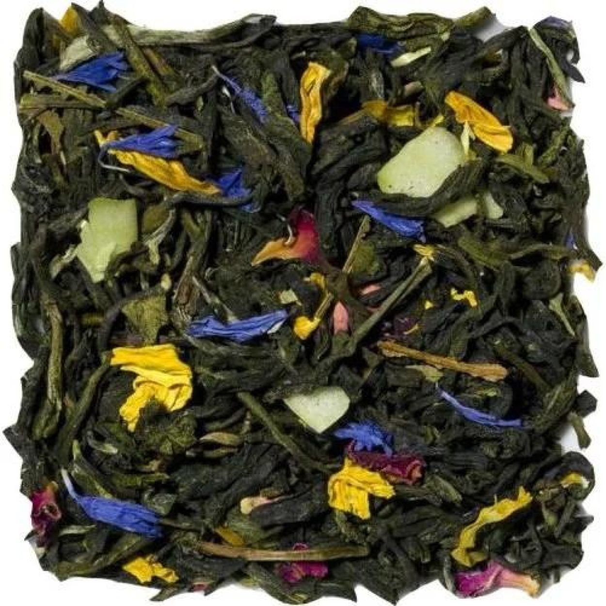 Thé blanc (90 %), arôme, chips de coco, feuilles de cassis doux, pétales de rose, pétales de bleuet, pétales de souci, pétales de tournesol.