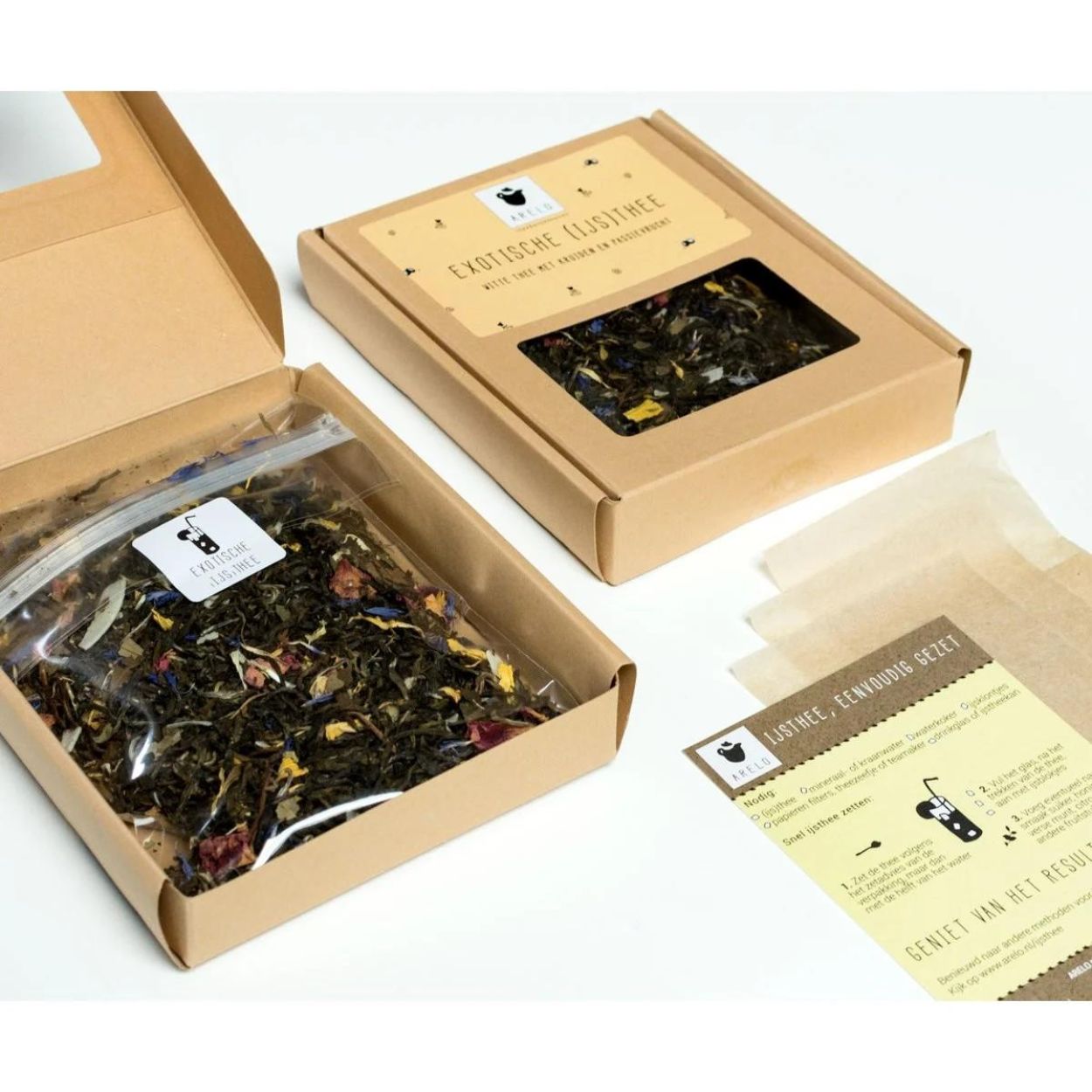Conditionné en sachet de 50 grammes et fourni avec trois filtres en papier.