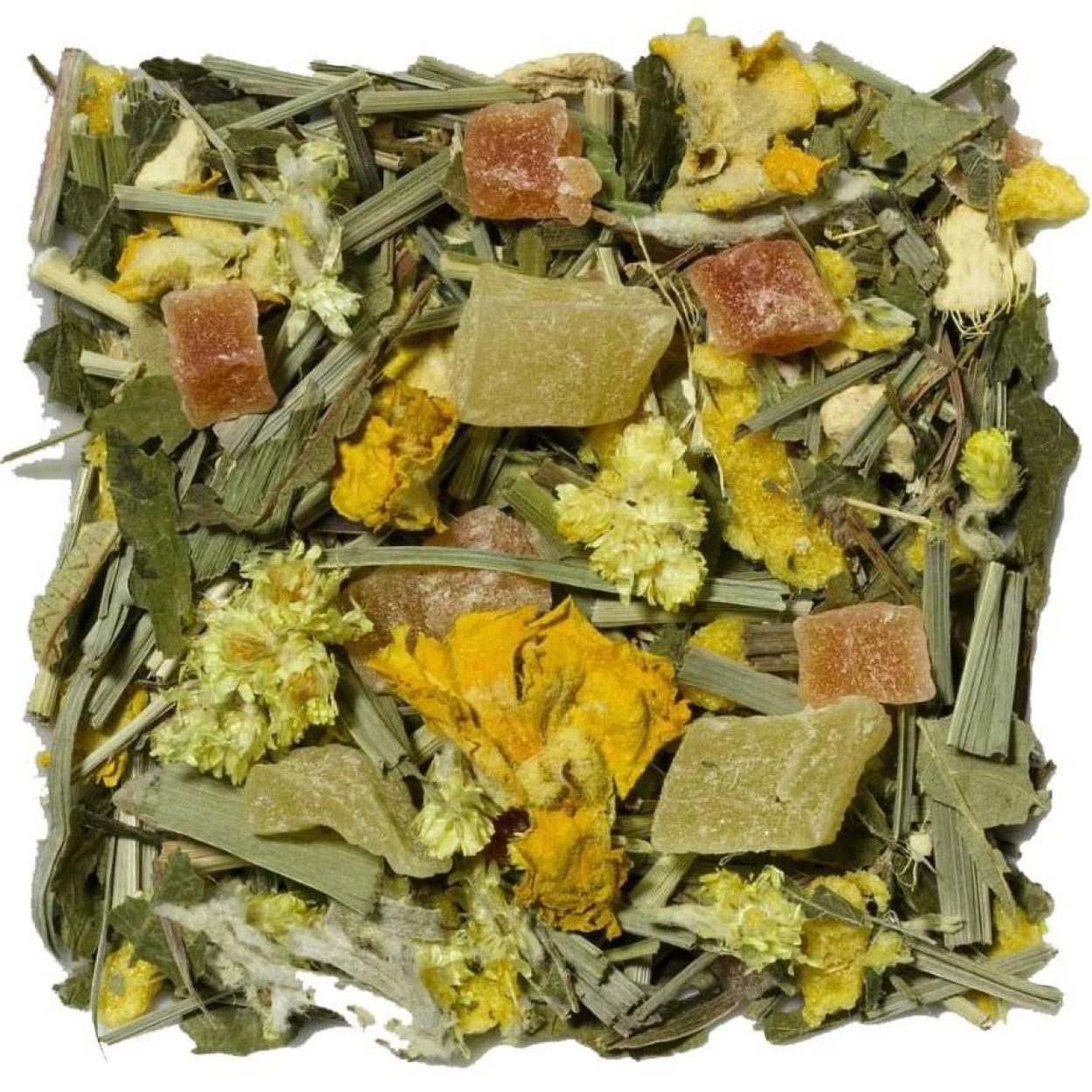 Morceaux de gingembre (gingembre, sucre), citronnelle, morceaux de papaye (papaye, sucre, acide citrique (régulateur d’acidité)), gingembre, cassis doux.