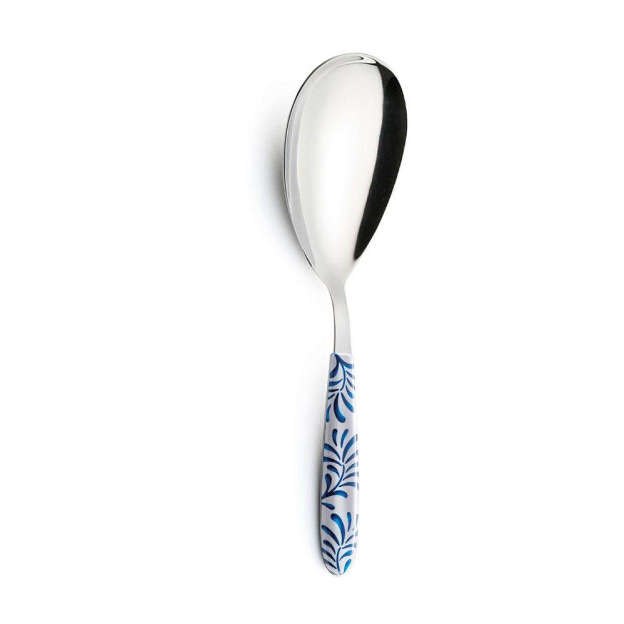 La cuillère à risotto Vero Mediterraneo associe un design moderne à une touche estivale. Son manche blanc décoré de feuilles bleues est imprimé par sublimation, offrant des couleurs durables et résistantes aux rayures.