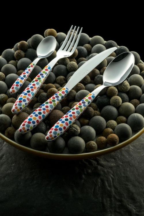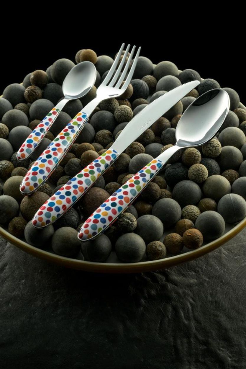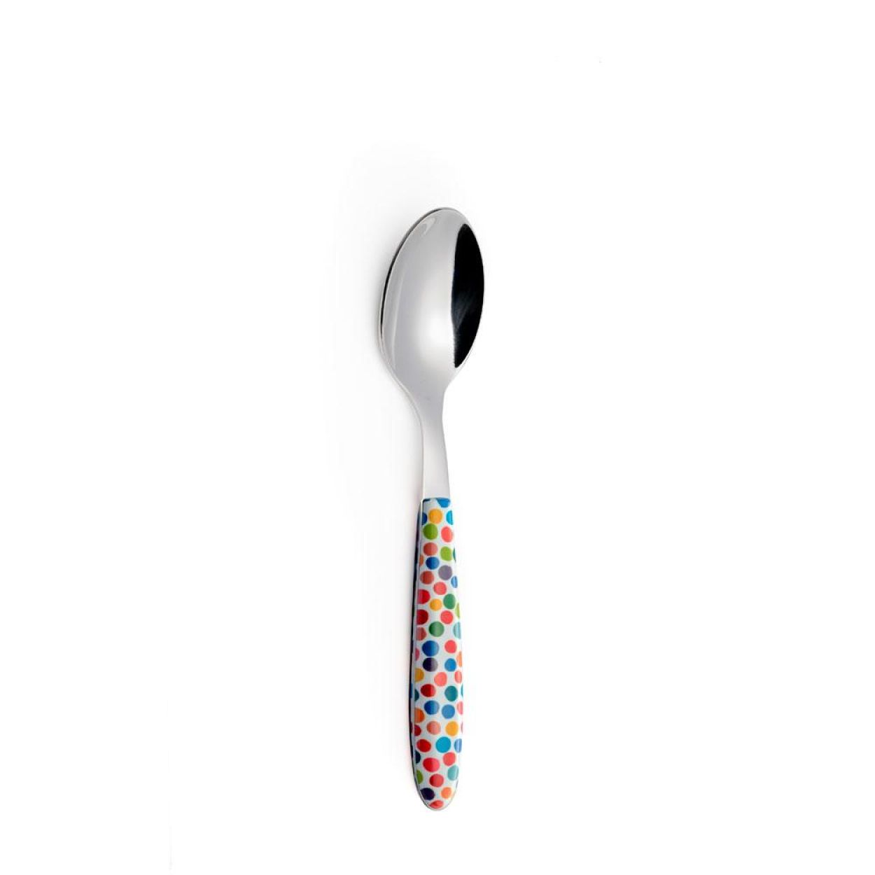 Cuillère de la collection Vero Coriandoli, avec un manche coloré au motif confettis. Le manche est en PBT, un plastique solide imprimé par sublimation pour garantir une bonne tenue des couleurs et une résistance aux rayures.