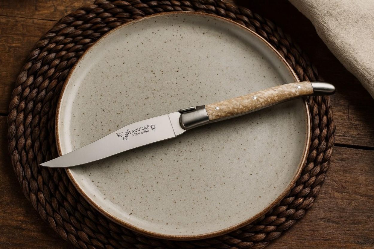 Les lames à finition mate apportent une touche contemporaine et élégante, tandis que le design emblématique Laguiole et l’équilibre parfait garantissent une prise en main confortable et une coupe précise. Un choix idéal pour ceux qui souhaitent allier raffinement, authenticité et originalité à table.