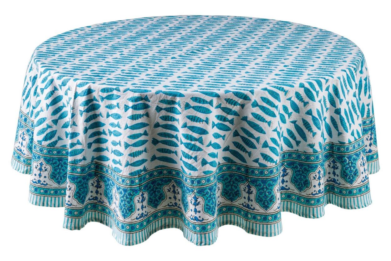Apportez une touche fraîche et marine à votre table avec cette nappe ronde au motif poisson. Fabriquée en coton, elle est idéale pour un usage quotidien ou une table élégamment dressée. Parfaite pour les tables rondes.