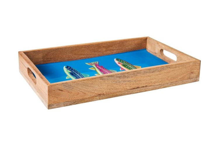 Servez vos boissons et amuse-bouches avec élégance grâce à ce plateau rectangulaire au motif poisson. Fabriqué en bois de manguier et résine, il est à la fois robuste et décoratif.