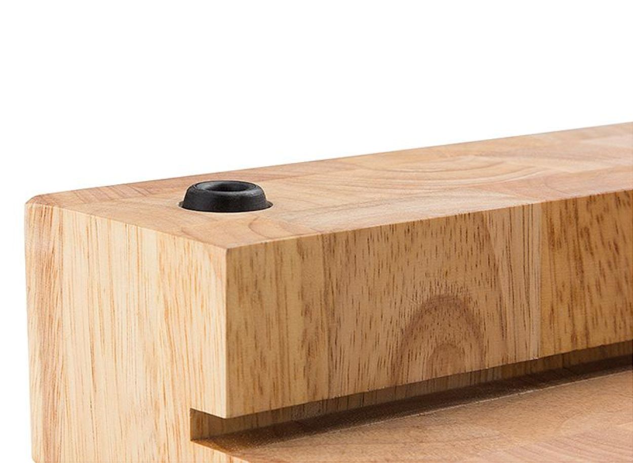 Le tiroir intégré en acier inoxydable est accessible des deux côtés et facilement amovible. Parfait pour recueillir les déchets, préparer les ingrédients ou ranger des ustensiles. La surface en mosaïque de cubes de bois avec anneaux de croissance visibles offre une excellente résistance à l’usure.