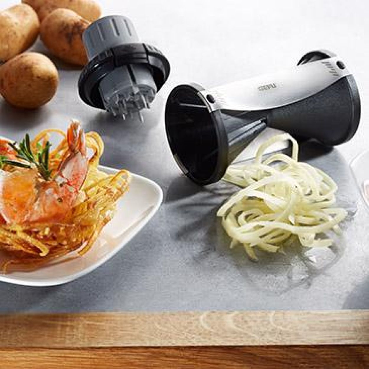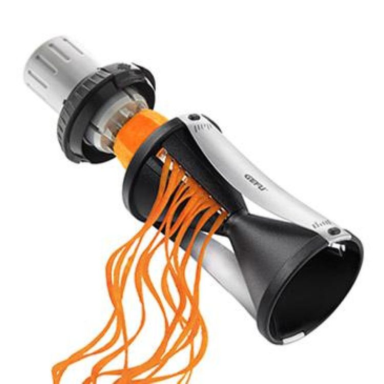 Fonctionnel et original! Avec le taille légumes spirelli 2.0, vous coupez des spirales fins (2 x 3 mm) ou gros (3,5 x 5 mm) de carottes, courgettes ou autres légumes! La protection pour doigt est très pratique et vous permet de coupez des spaghettis en toute sécurité.