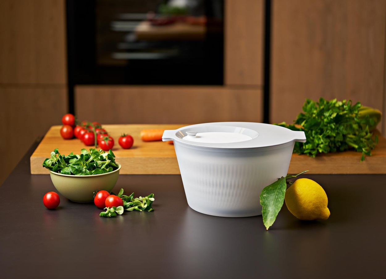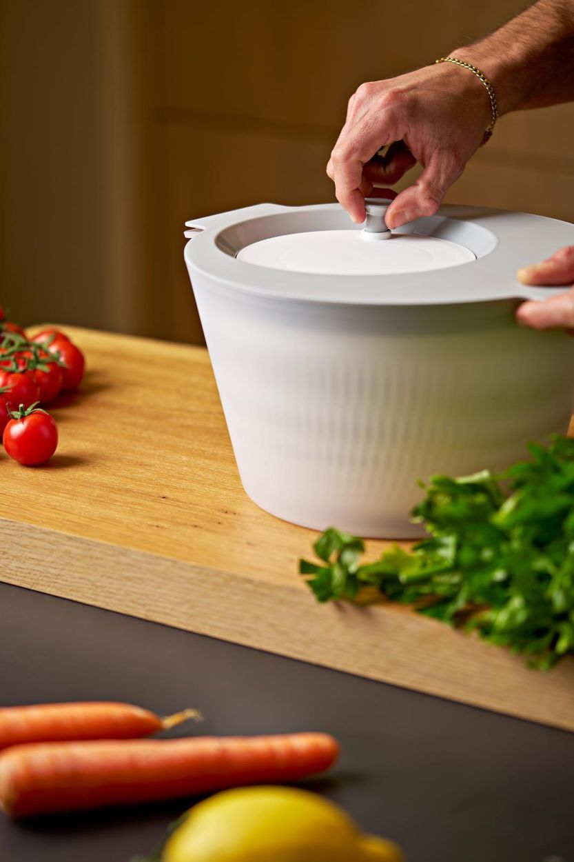 Tournez. Cliquez. Servez. Avec la centrifugeuse à salade Guzzini (ø30 cm), vos salades sont prêtes en un clin d’œil – fraîches et parfaitement essorées. Son panier intérieur est conçu pour éviter que les feuilles ou les aliments décongelés ne baignent dans l’eau.