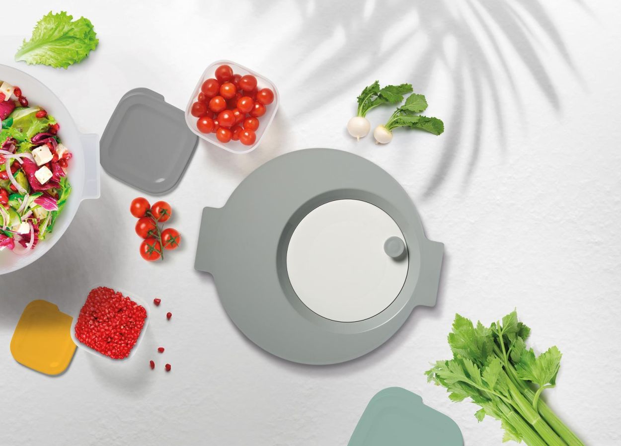 Le bouton rabattable permet un rangement facile, et le bol devient une élégante saladier à poser directement sur la table. Deux poignées pratiques et un couvercle multifonction, aussi utile comme plan de travail.