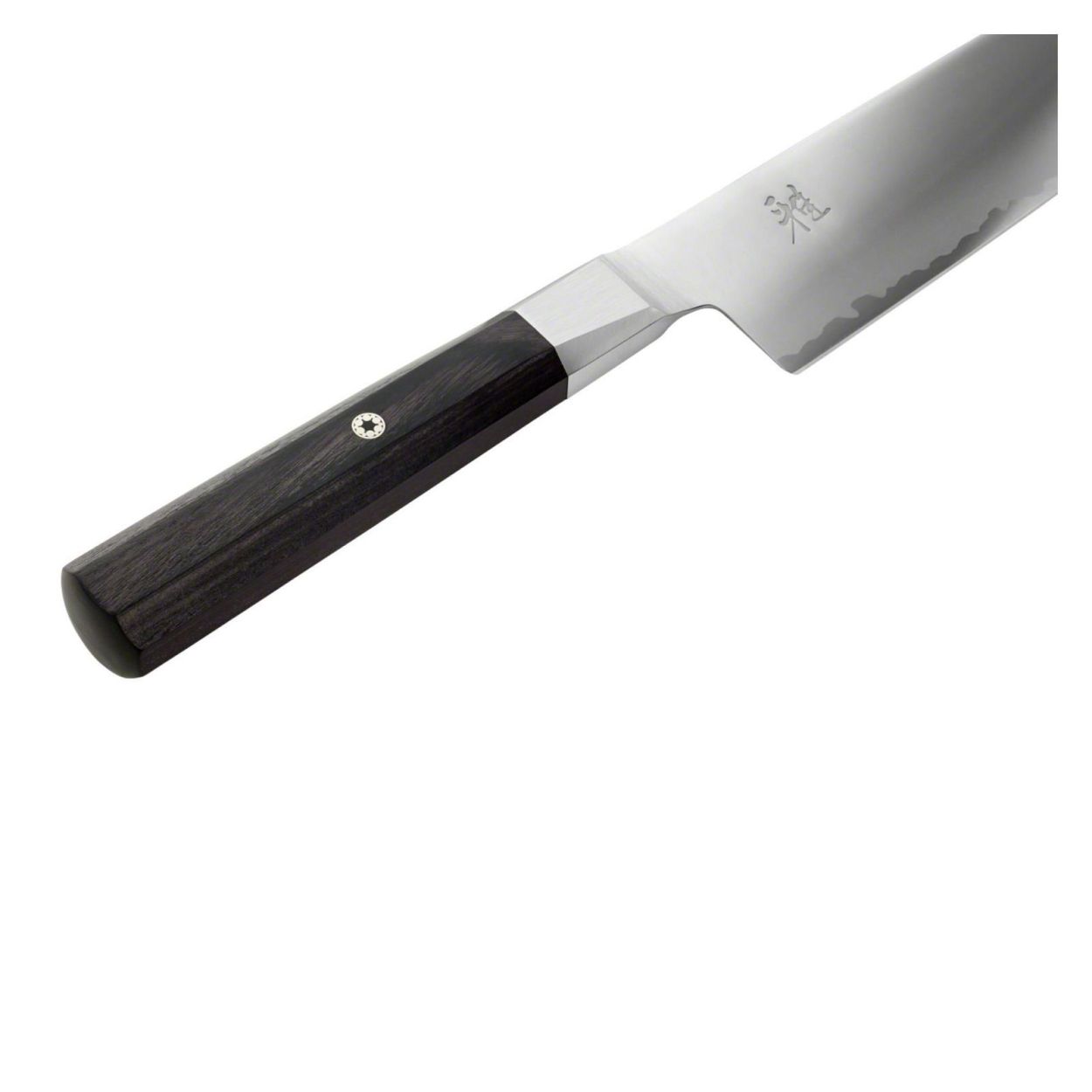 Le style Santoku, qui signifie littéralement "trois vertus", fait référence à la polyvalence de la lame : parfaite pour couper la viande, le poisson et les légumes. La mitre partielle permet une prise en main légère et équilibrée, offrant un contrôle optimal à chaque geste, tandis que le tranchant lisse garantit des coupes nettes et précises.