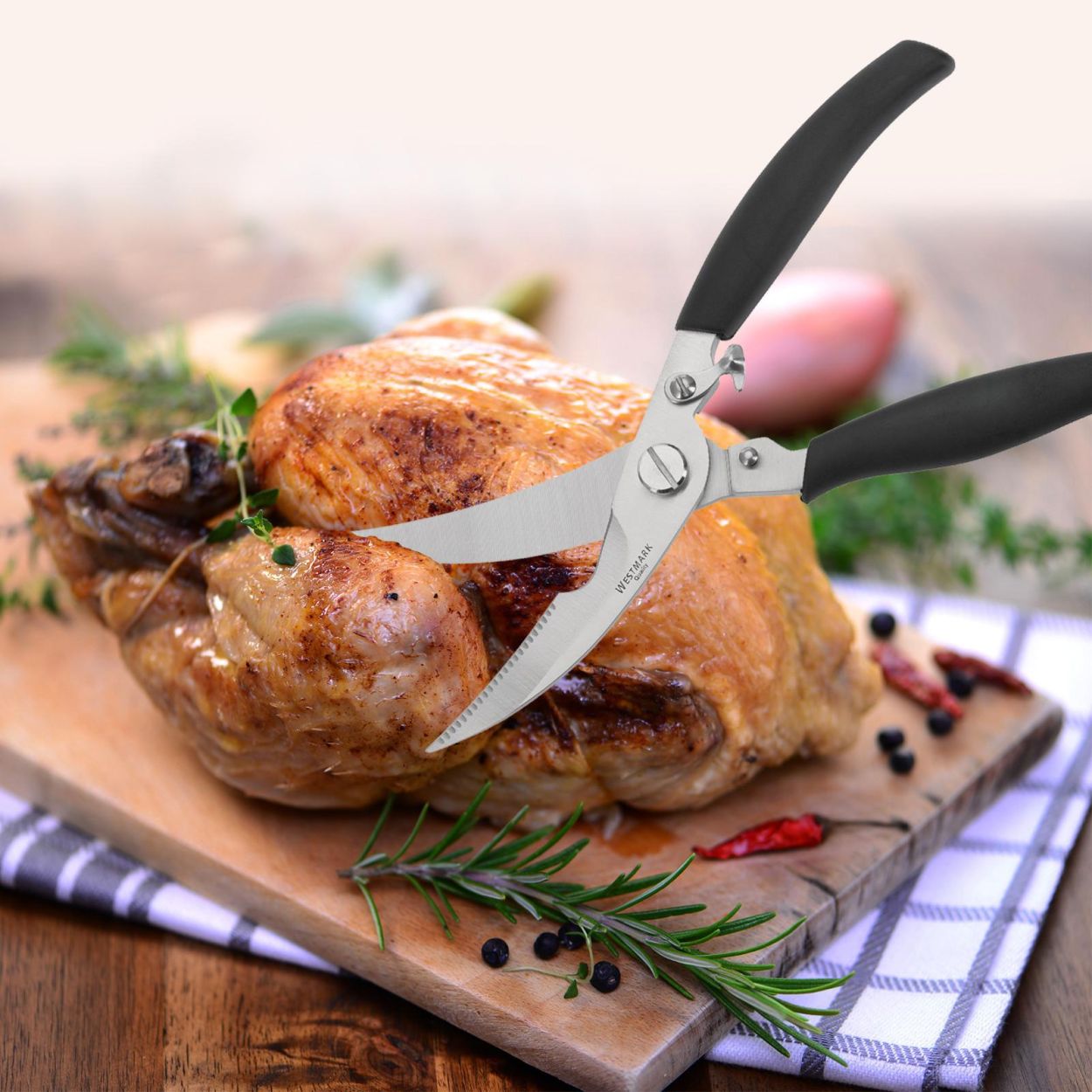 Ces ciseaux robustes permettent de découper poulet, dinde et autres volailles proprement et sans effort. Le tranchant dentelé et le casse-os intégré viennent à bout des parties plus dures. Grâce au ressort intérieur et au système de verrouillage, l’utilisation est fluide et sécurisée. Les poignées recouvertes de plastique offrent un confort supplémentaire.