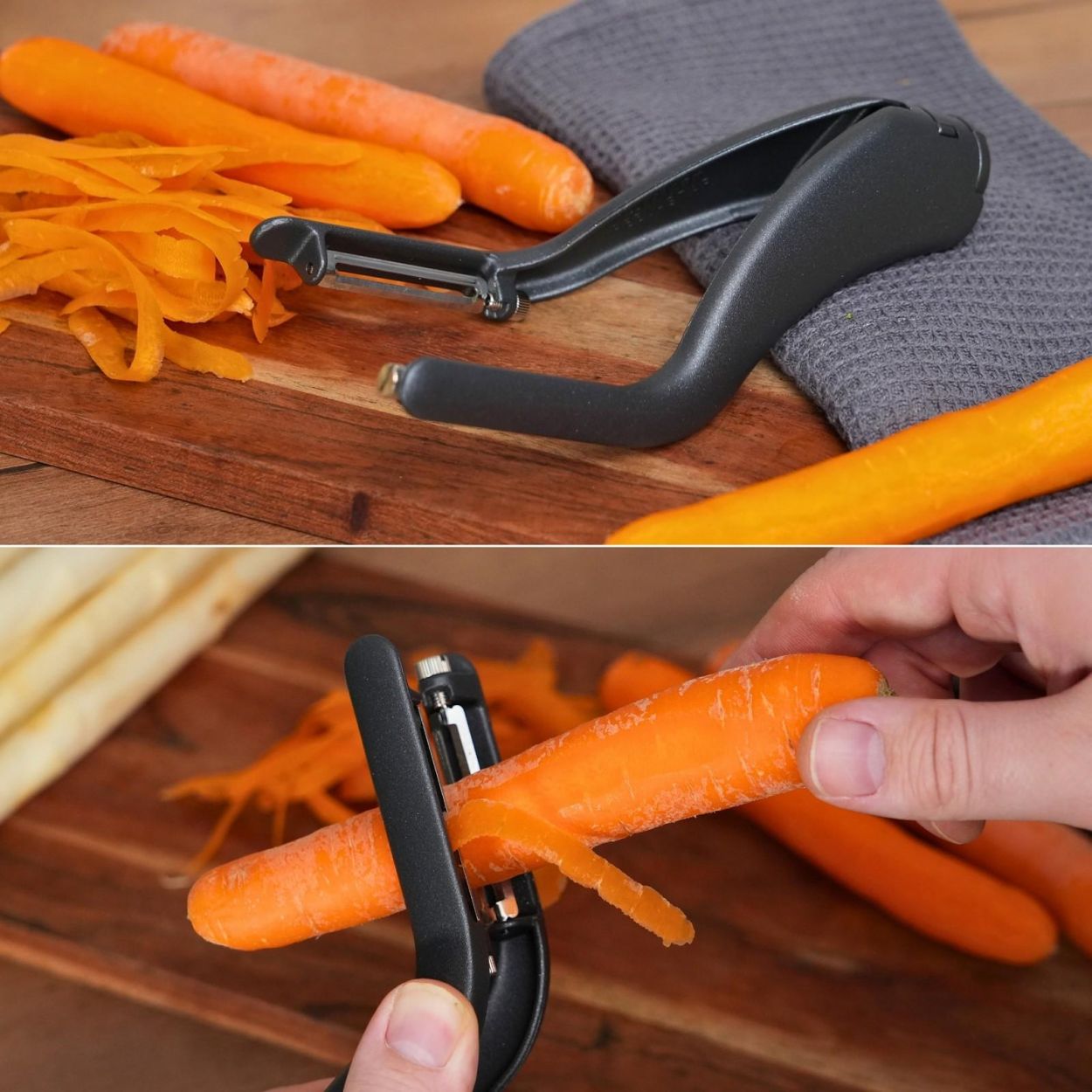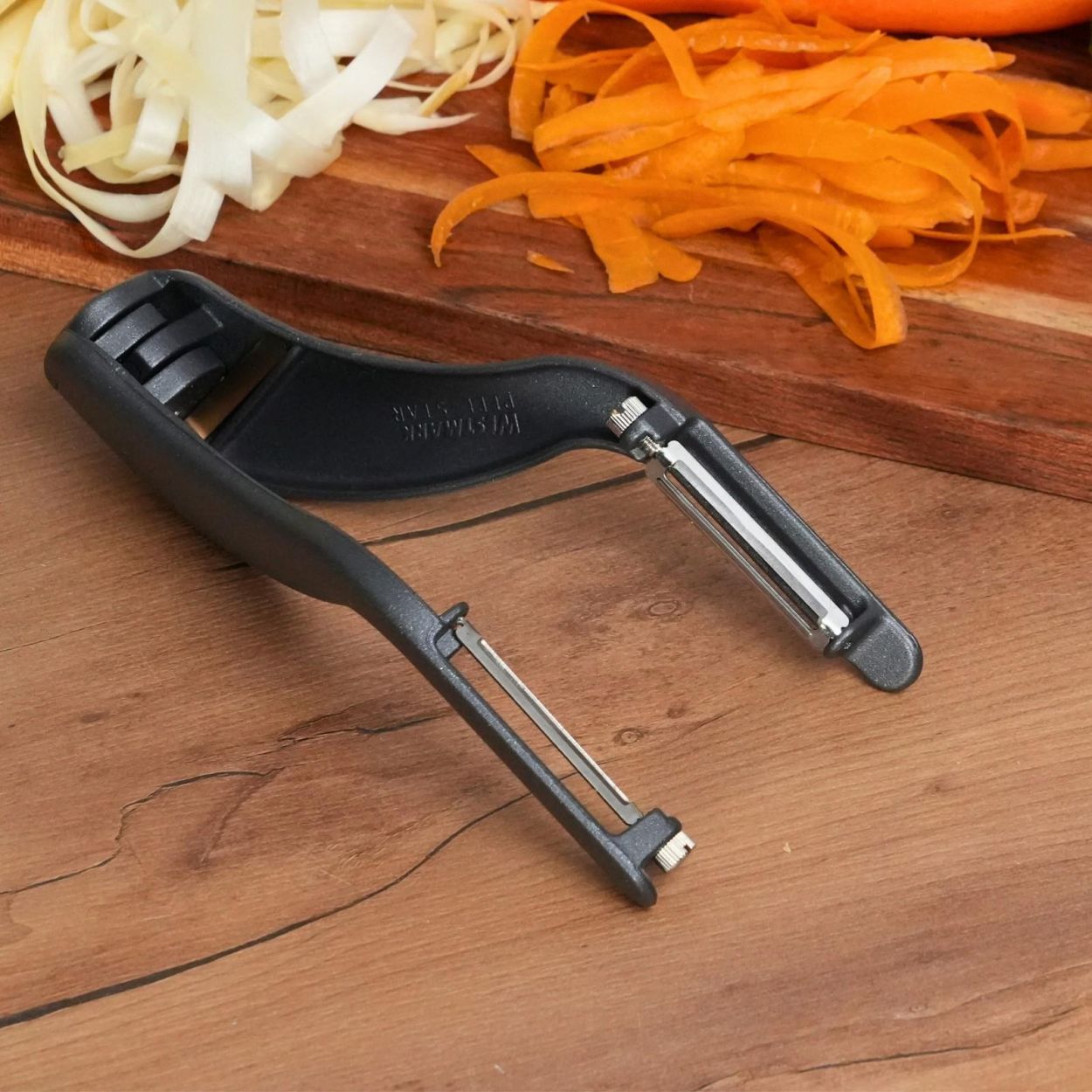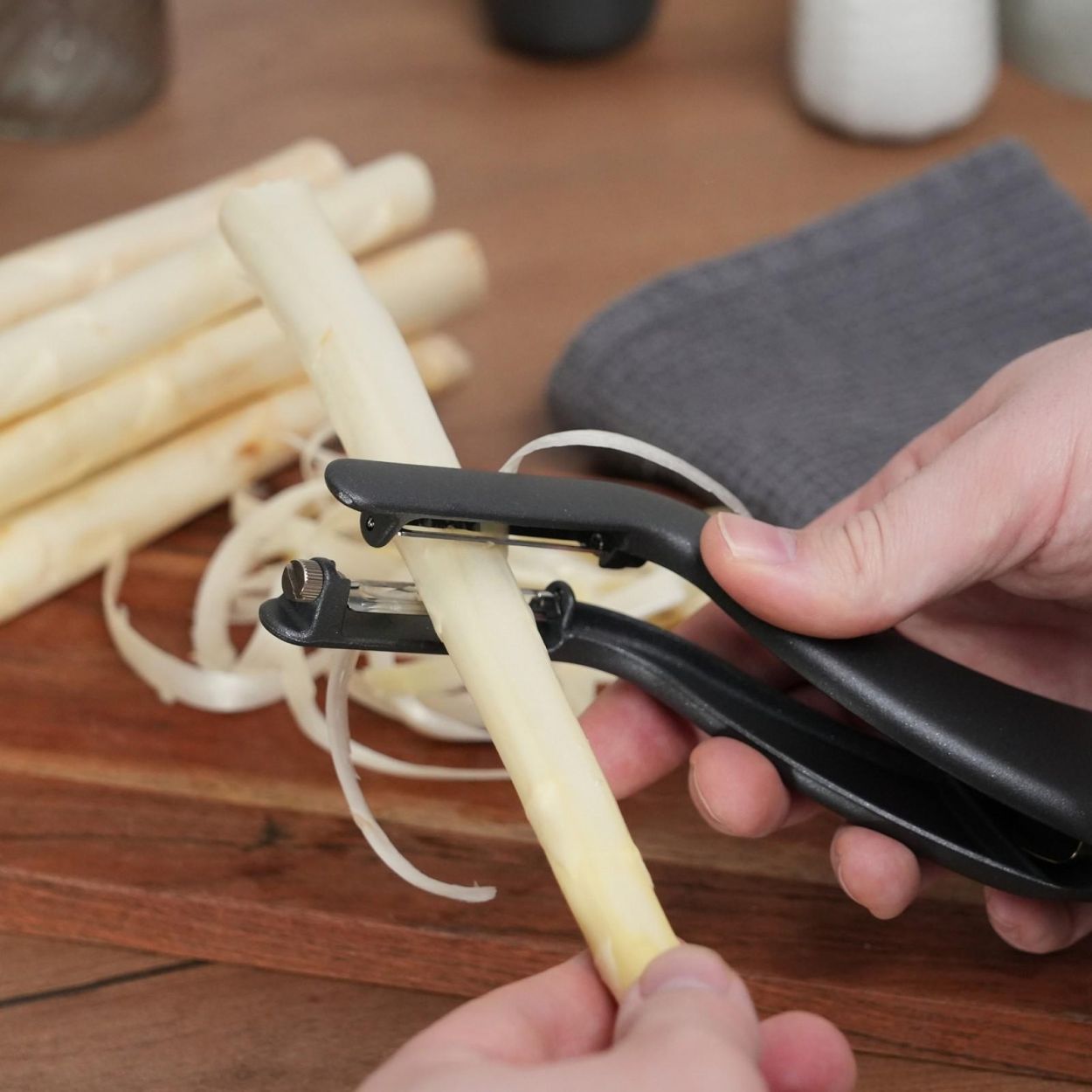 Épluchez plus vite, plus facilement et avec style grâce à l’éplucheur double « Peel-Star Alu » Black Edition. Son système innovant à double lame permet d’éplucher les légumes des deux côtés en un seul geste – idéal pour les asperges, carottes et autres légumes longs.