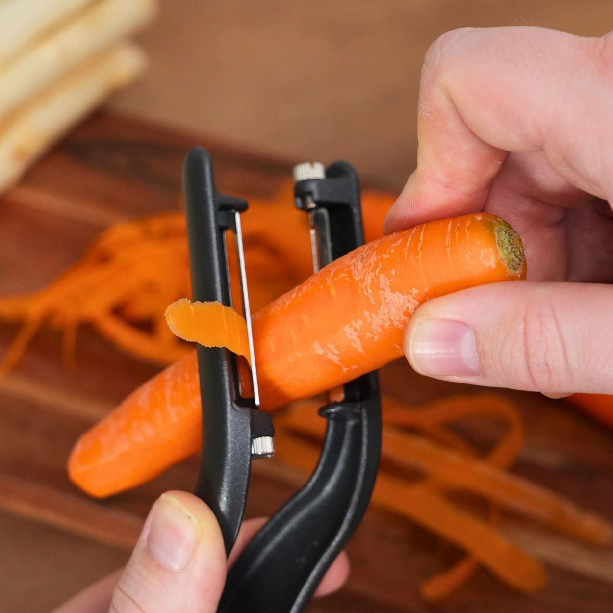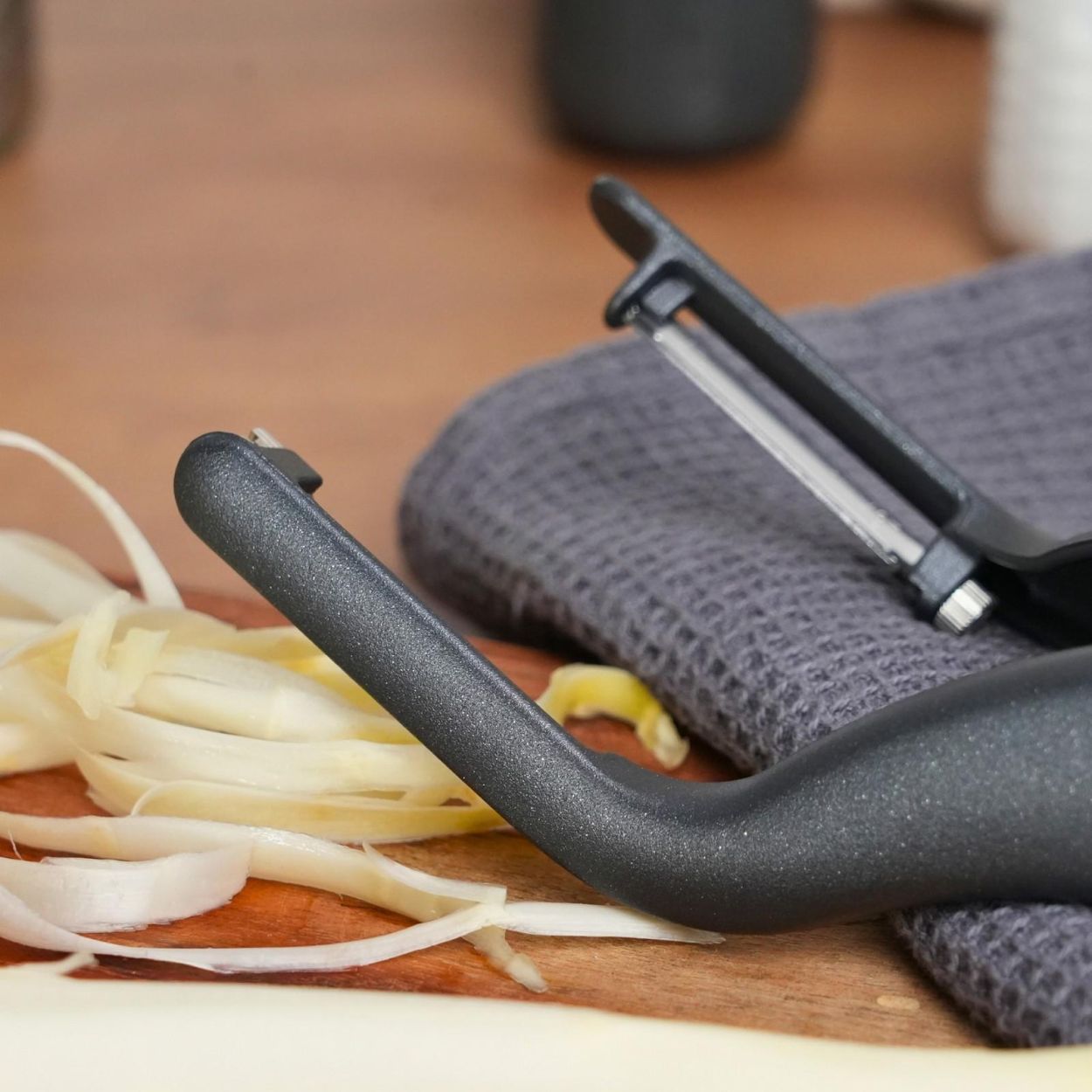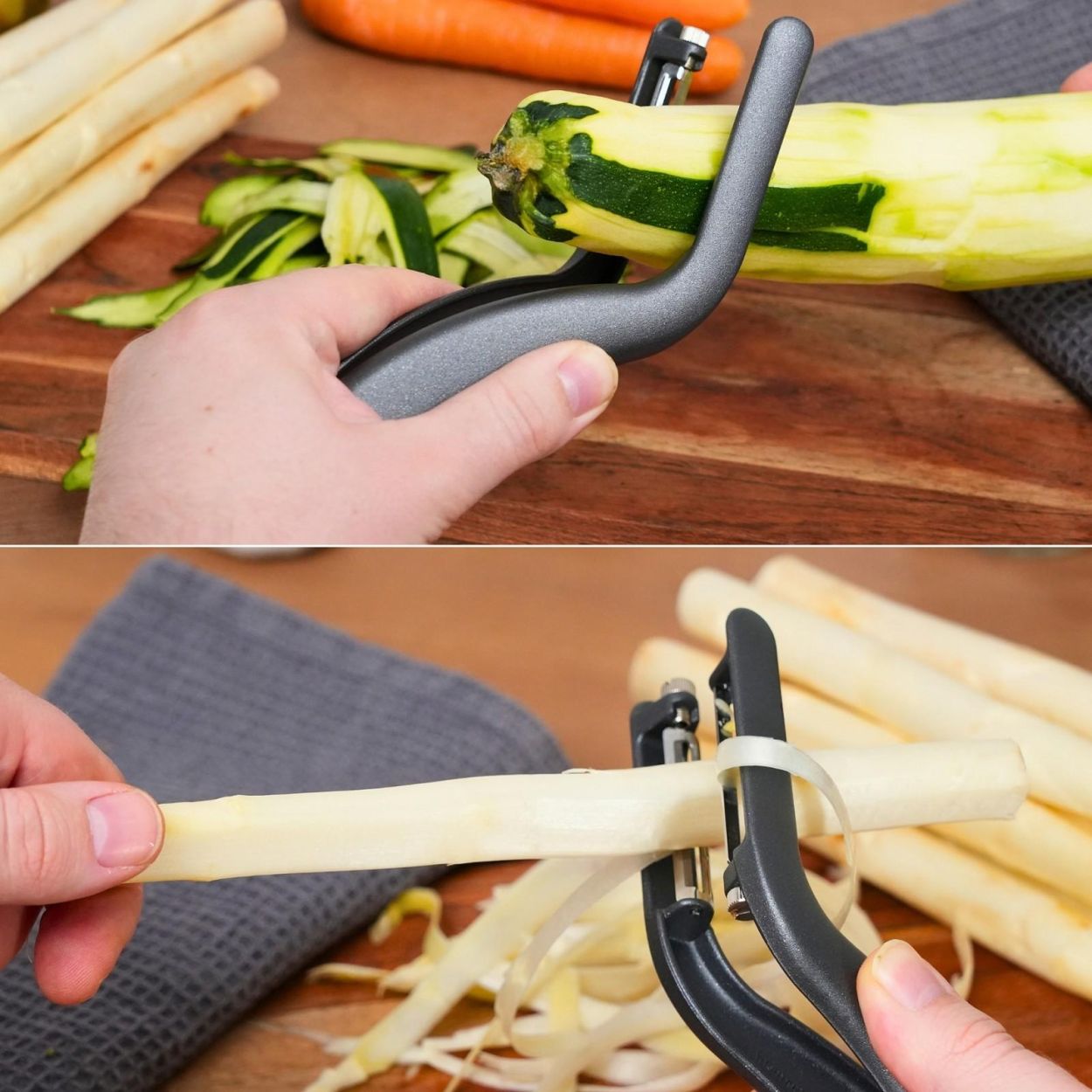 Épluchez plus vite, plus facilement et avec style grâce à l’éplucheur double « Peel-Star Alu » Black Edition. Son système innovant à double lame permet d’éplucher les légumes des deux côtés en un seul geste – idéal pour les asperges, carottes et autres légumes longs.