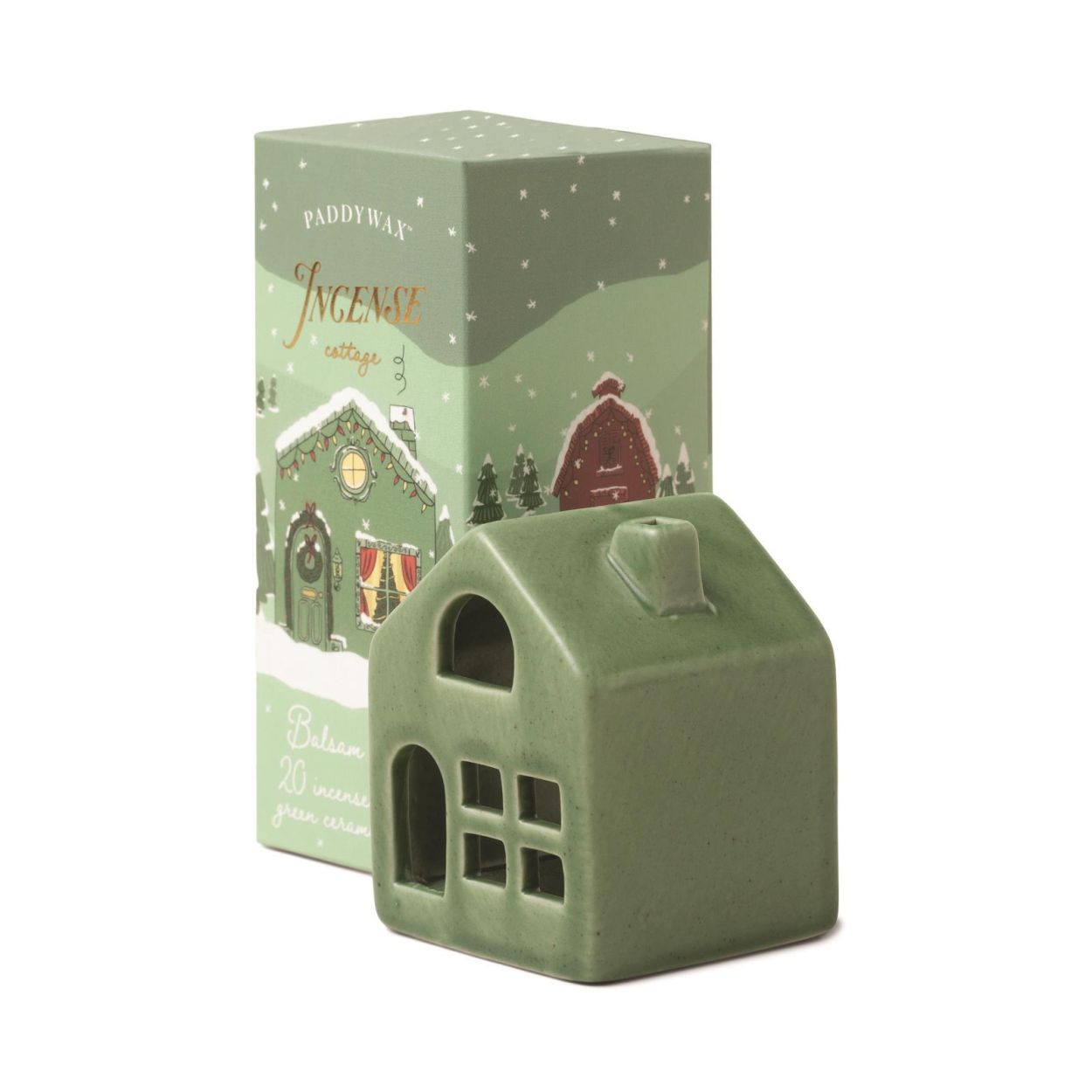 Une maisonnette verte en céramique avec cheminée : allumez un cône d’encens et la fumée s’échappe doucement par la cheminée. Parfum Balsam & Sapin – comme une promenade en forêt hivernale.