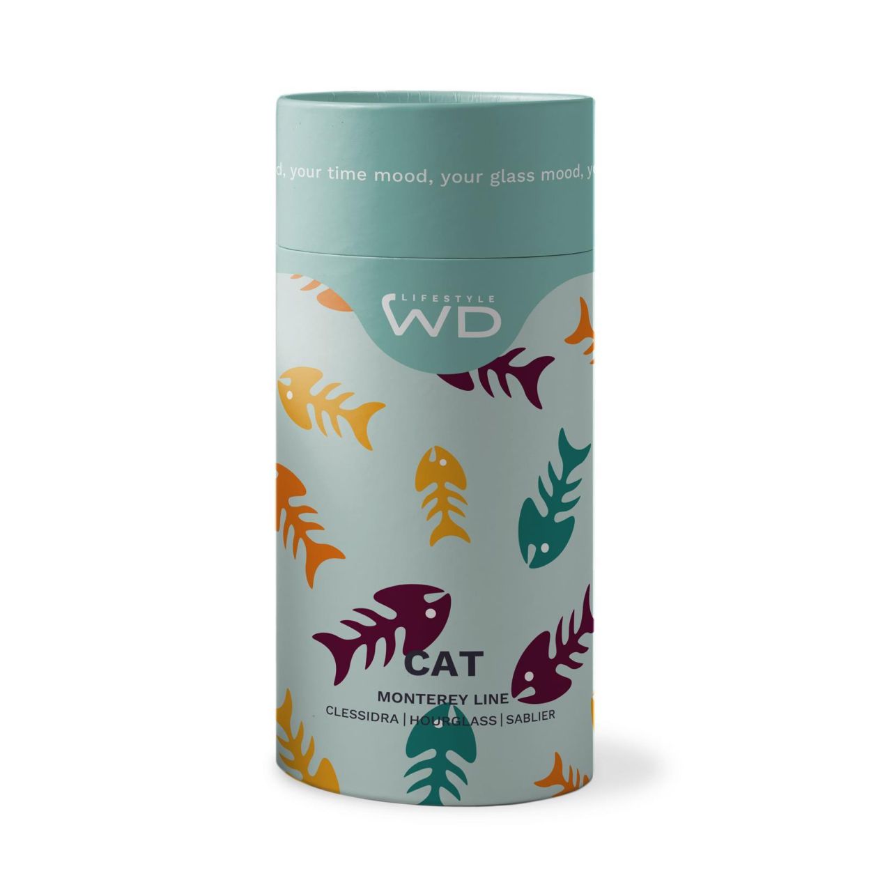 Un sablier qui prend son temps, comme un vrai chat. Au centre, un petit chat en verre, entouré de sable coloré qui s’écoule doucement.
