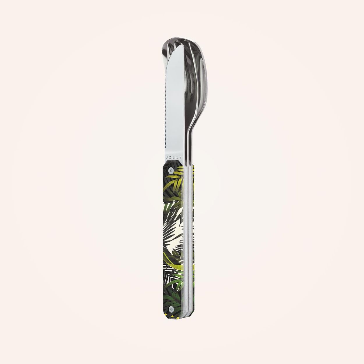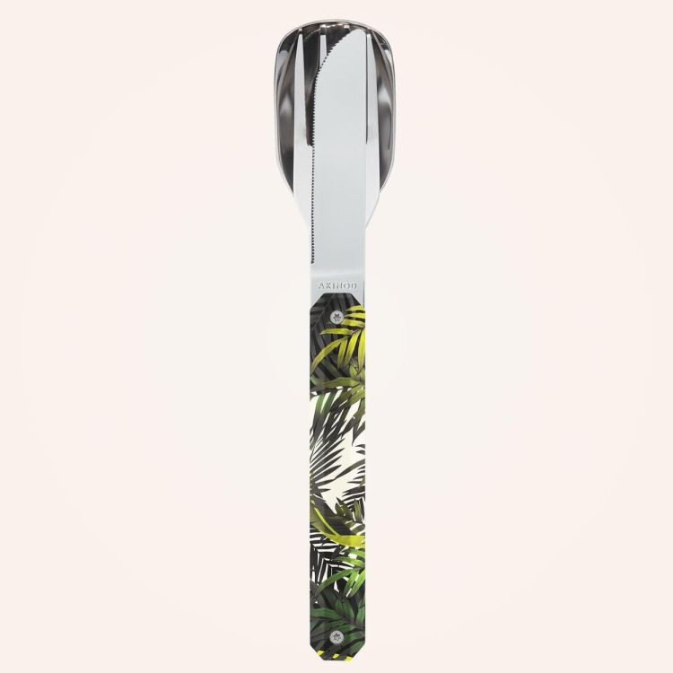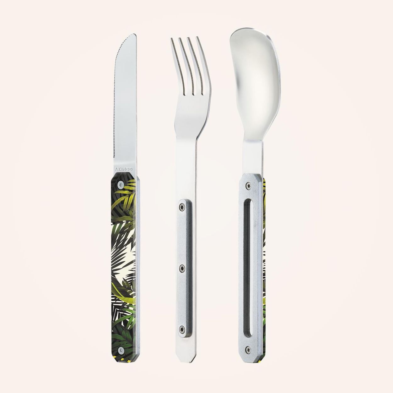 Set de couverts en acier inoxydable avec finition brilliante et une manche décoré. Le set contient une cuillère, une fourchette et un couteau micro-denté. Les couverts sont facile à ranger après usage grâce à les manches magnétiques.