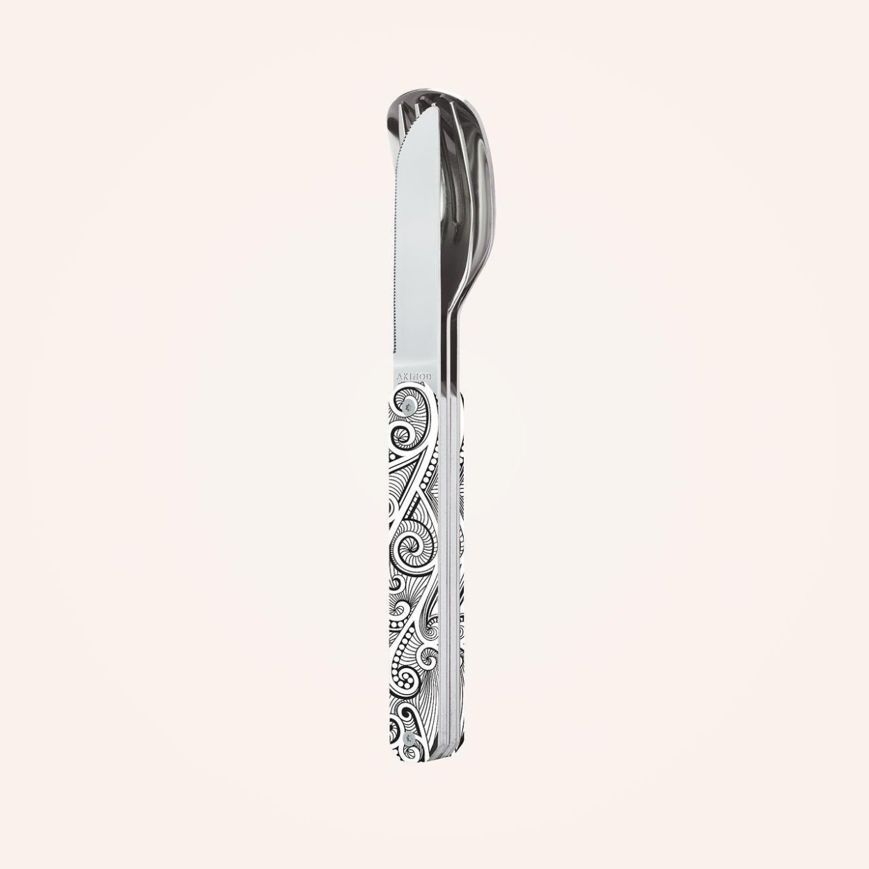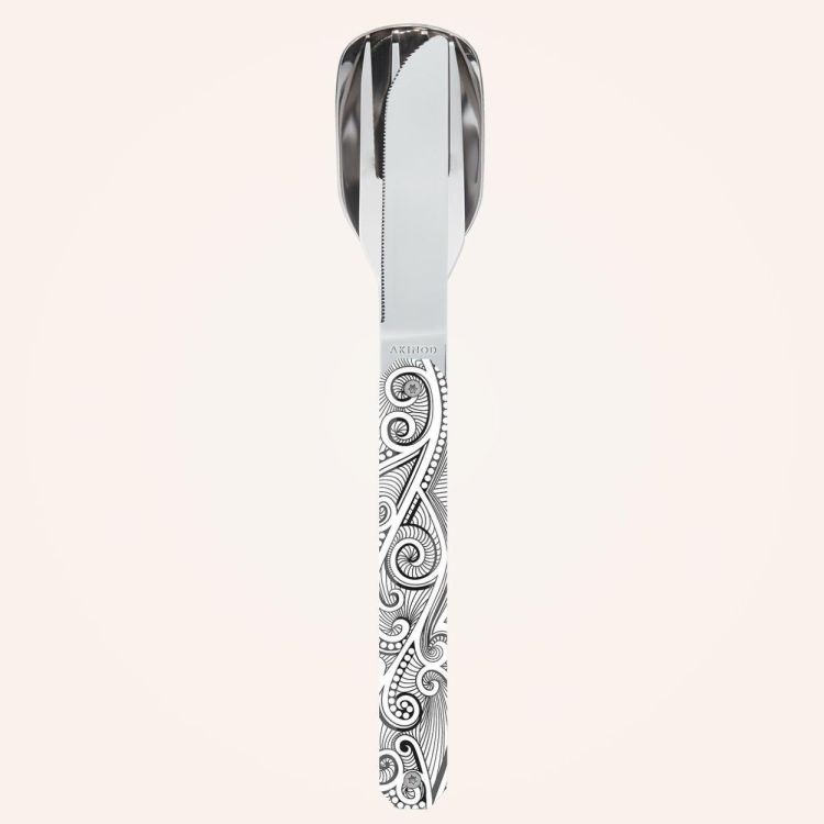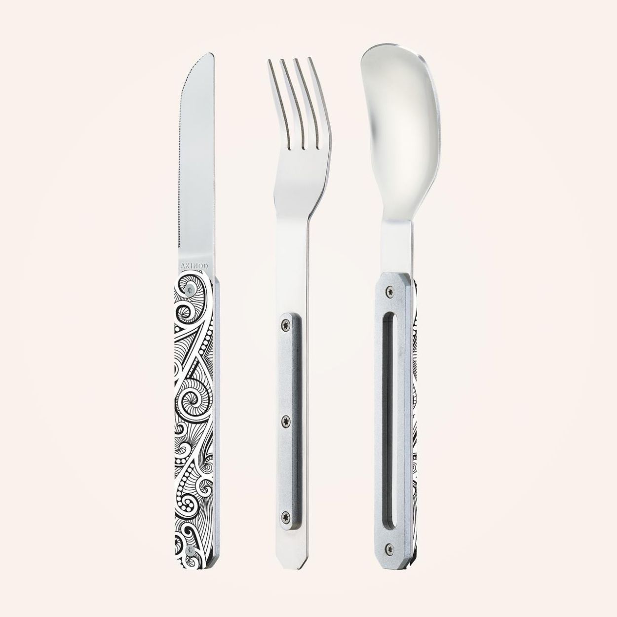 Set de couverts en acier inoxydable avec finition brilliante et une manche décoré. Le set contient une cuillère, une fourchette et un couteau micro-denté. Les couverts sont facile à ranger après usage grâce à les manches magnétiques.