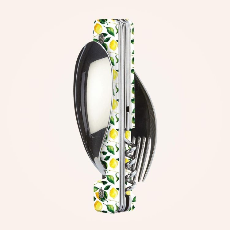 Set de couverts en acier inoxydable avec finition brilliante et une manche décoré. Le set multitool contient une cuillère, une fourchette, un couteau micro-denté et un ouvre-boîte, qui sont facilement à ranger grâce à la système repliable. Les couverts sont facile à ranger après usage grâce à les manches magnétiques.
