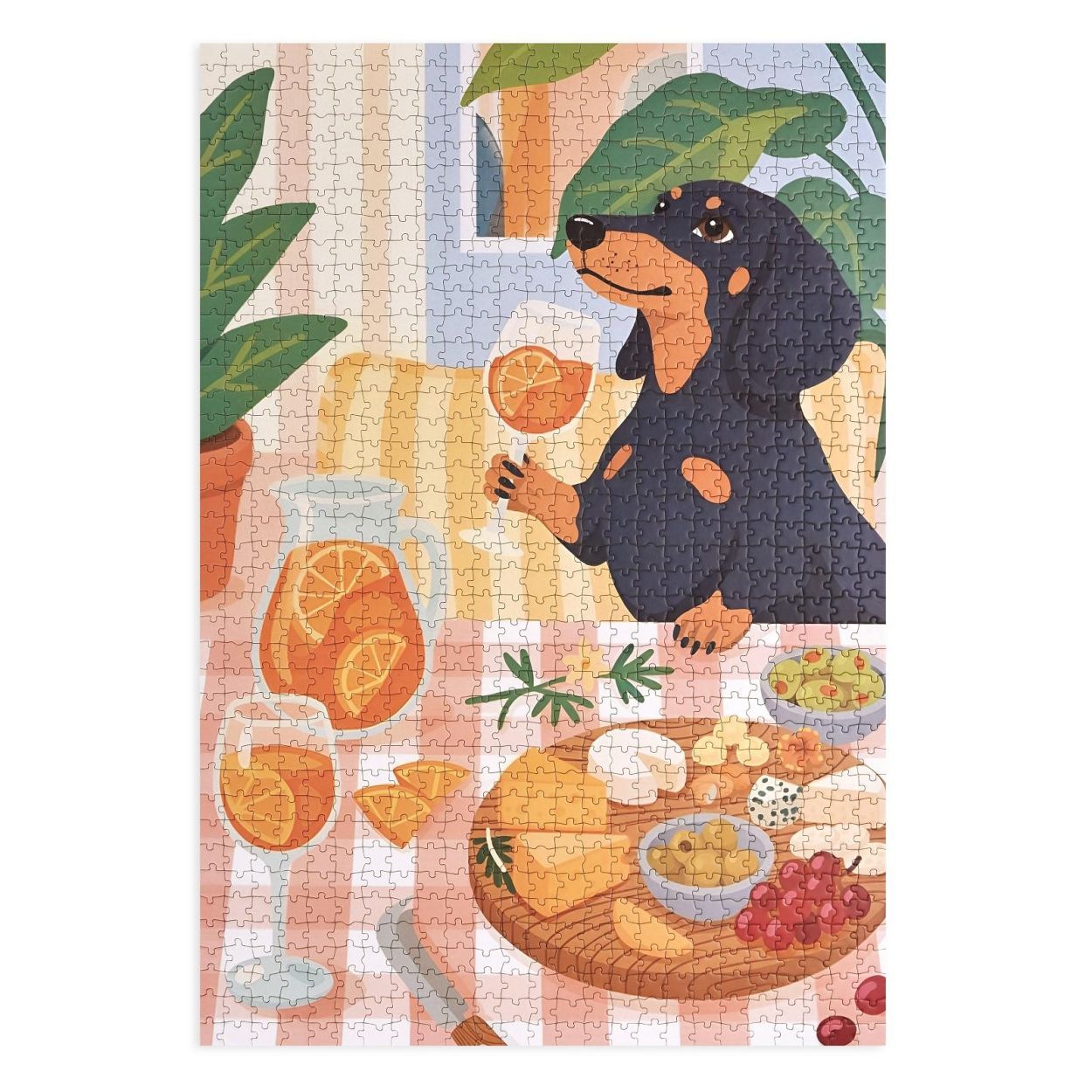 Envie d’un moment détente ? Avec le puzzle Spritz Time, découvrez une illustration pleine de charme signée Yuna Moona, avec des chiens adorables, de bons petits plats et une ambiance apéro conviviale.