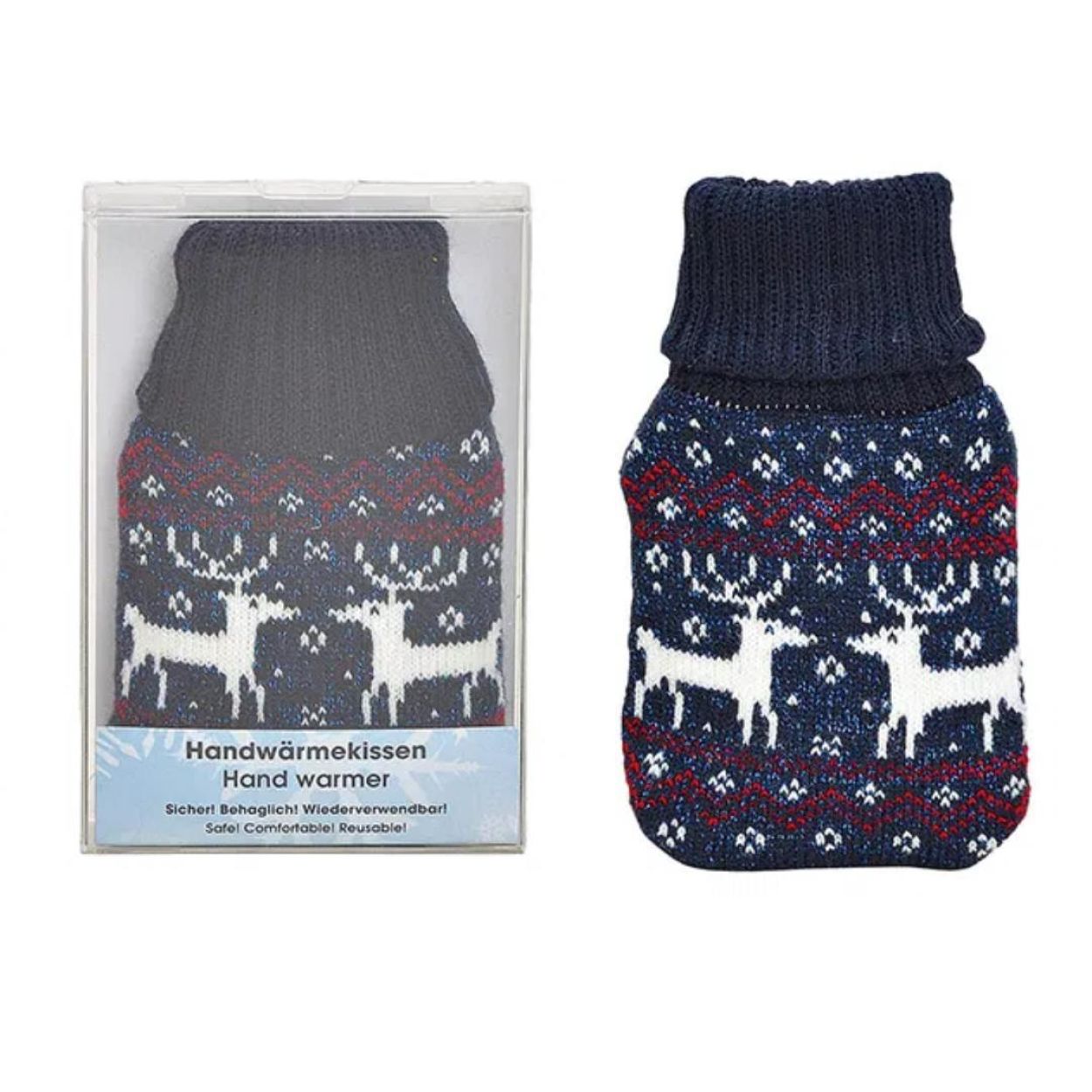 Chauffe-mains avec housse tricotée motif élan. Sûr, confortable et réutilisable. Parfait contre le froid.