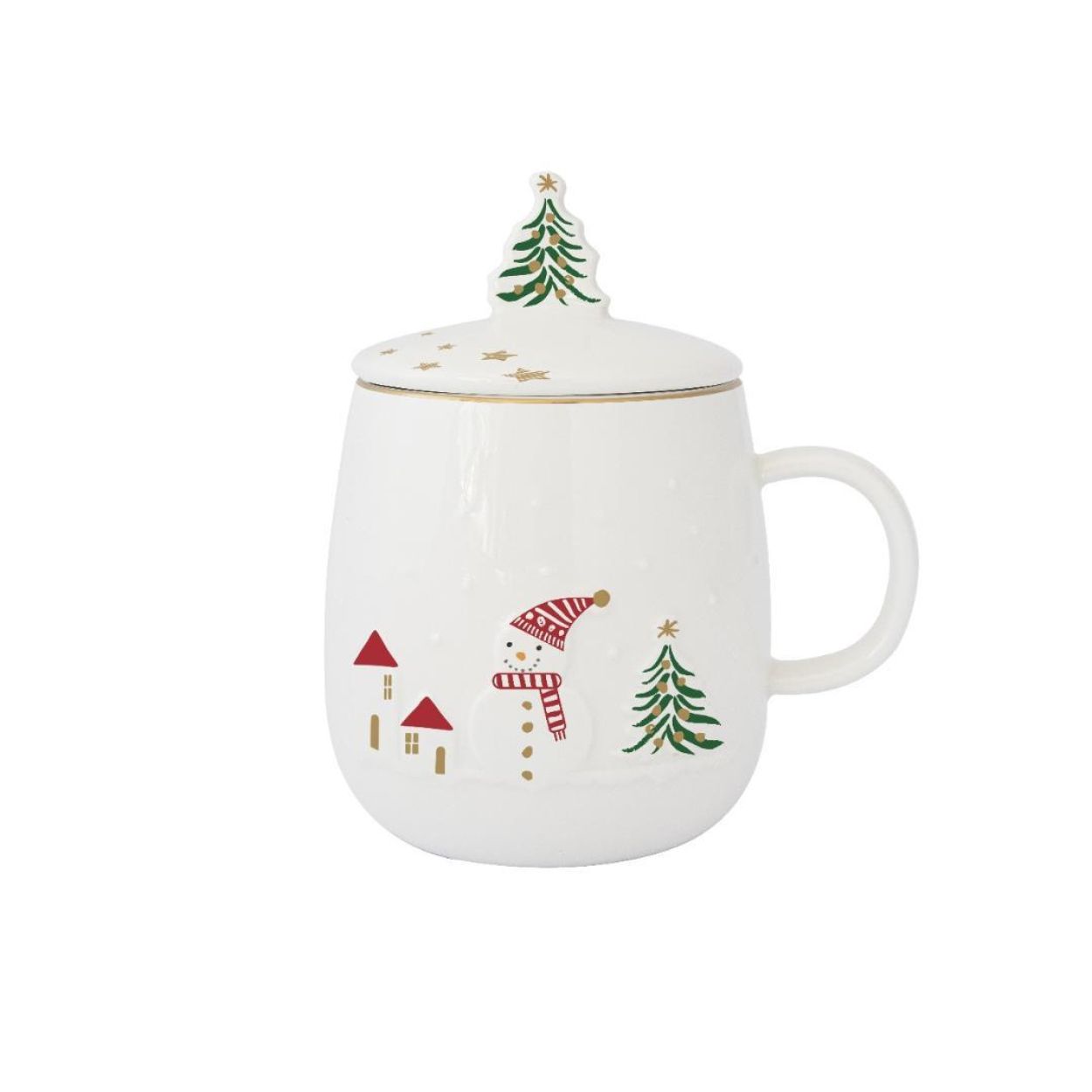 Tasse en porcelaine avec filtre en métal et couvercle assorti, capacité 450 ml. Le couvercle est surmonté d’un petit sapin de Noël qui sert de poignée – pratique et décoratif.