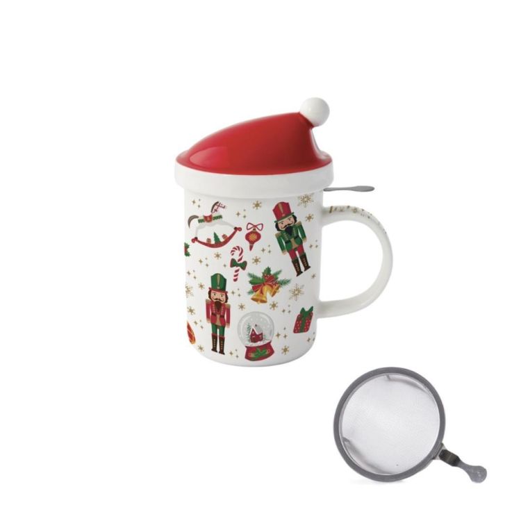 Tasse à thé en porcelaine de 450 ml, avec filtre en métal et couvercle original en forme de bonnet de Noël. Le couvercle garde la chaleur et ajoute une touche festive à la pause thé.