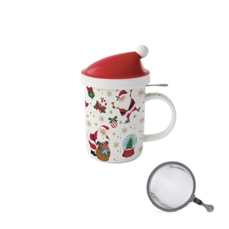 Tasse à thé en porcelaine de 450 ml, avec filtre en métal et couvercle original en forme de bonnet de Noël. Le couvercle garde la chaleur et ajoute une touche festive à la pause thé.