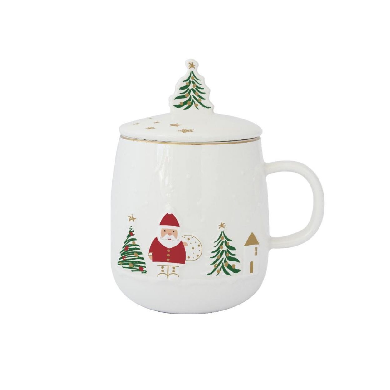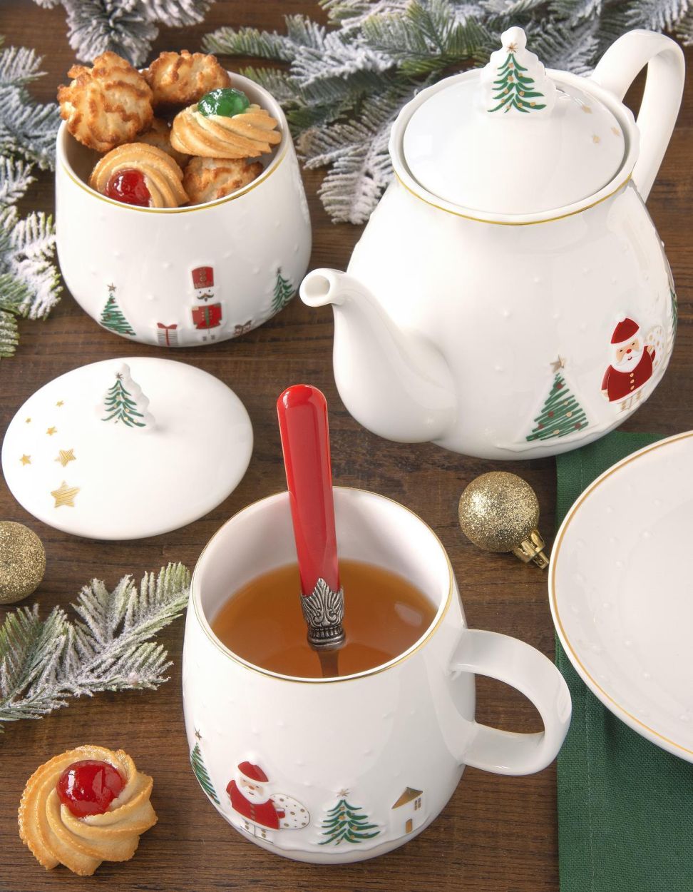 Tasse en porcelaine avec filtre en métal et couvercle, capacité 450 ml. Le couvercle est surmonté d’un petit sapin de Noël qui sert de poignée – joli et pratique.