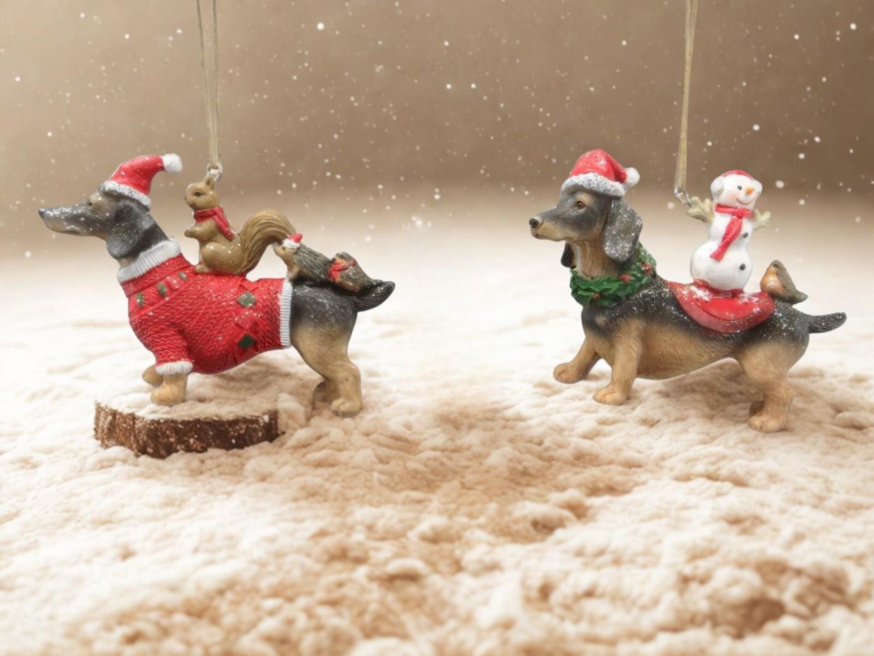 Avec son bonnet de Noël et ses amis sur le dos, ce teckel de 10 cm signé La Galleria est une boule de Noël joyeuse qui donne instantanément le sourire.