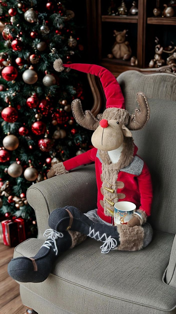 On dirait qu’il revient tout juste d’une balade d’hiver : cet élan assis de 156 cm signé La Galleria. Bonnet de Noël en velours rouge vissé sur la tête, manteau fermé, bottes de neige aux pieds – prêt à sublimer ton coin de Noël.