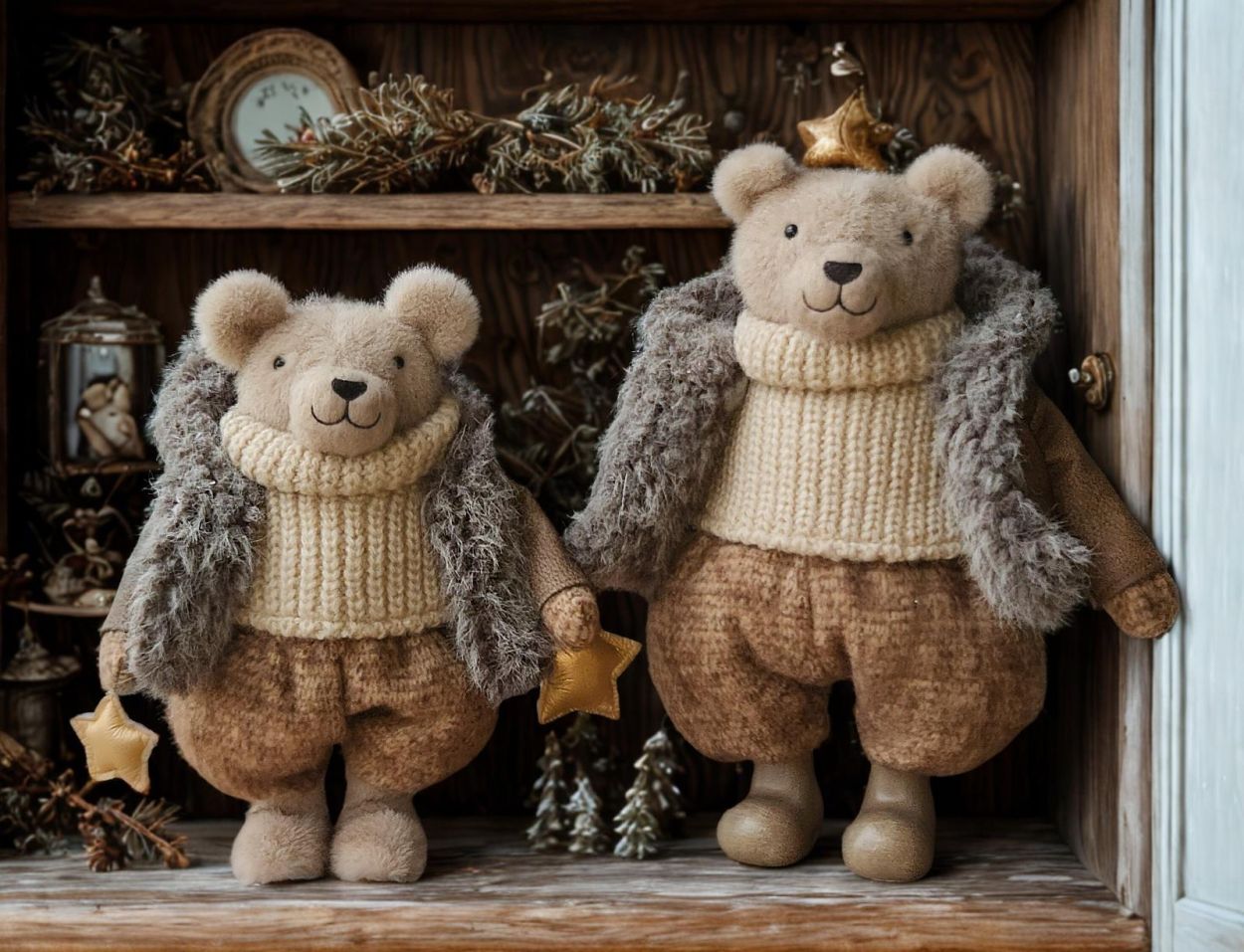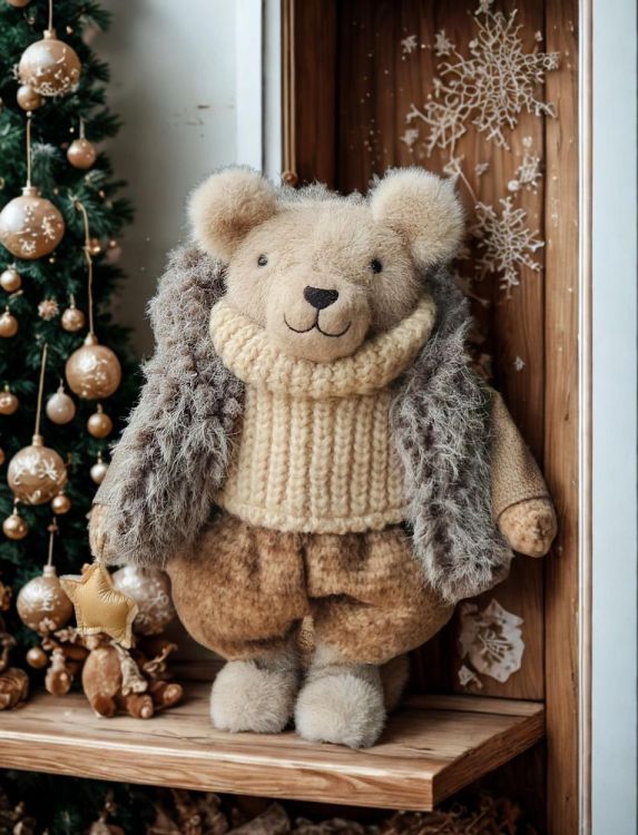 Avec sa veste en cuir, son pull tricoté et sa finition raffinée, cet ours debout de 33 cm signé La Galleria est une pièce élégante qui respire le charme de l’hiver.