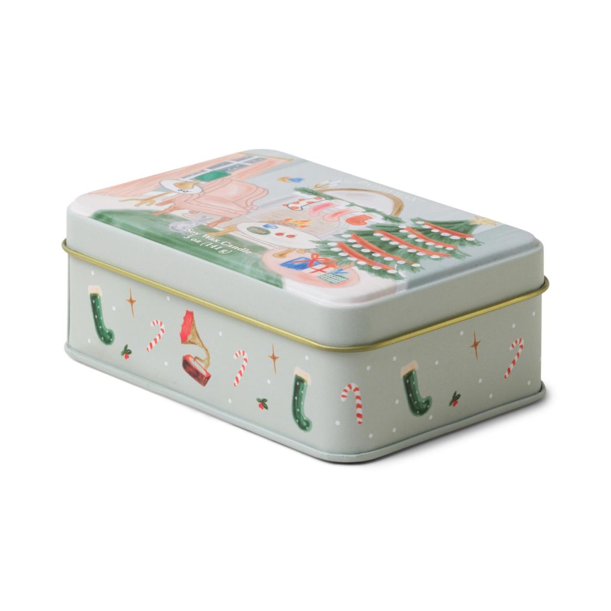 Une petite bougie de Noël en boîte métallique, parfaite à emporter en voyage ou à offrir. Avec 2 mèches et 5 oz de cire de soja, elle diffuse un parfum chaleureux et festif qui met instantanément dans l’ambiance des fêtes. La boîte est décorée de motifs vintage dessinés à la main pour une touche nostalgique.