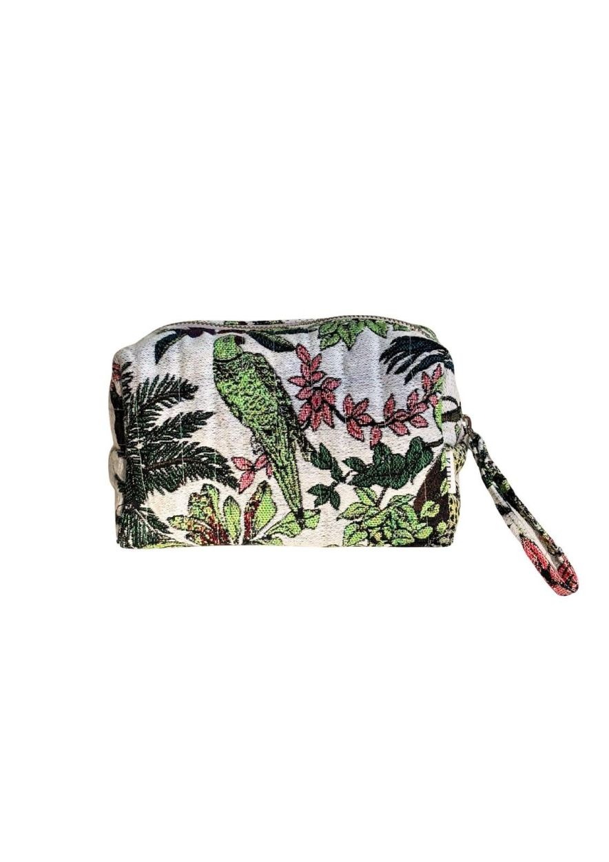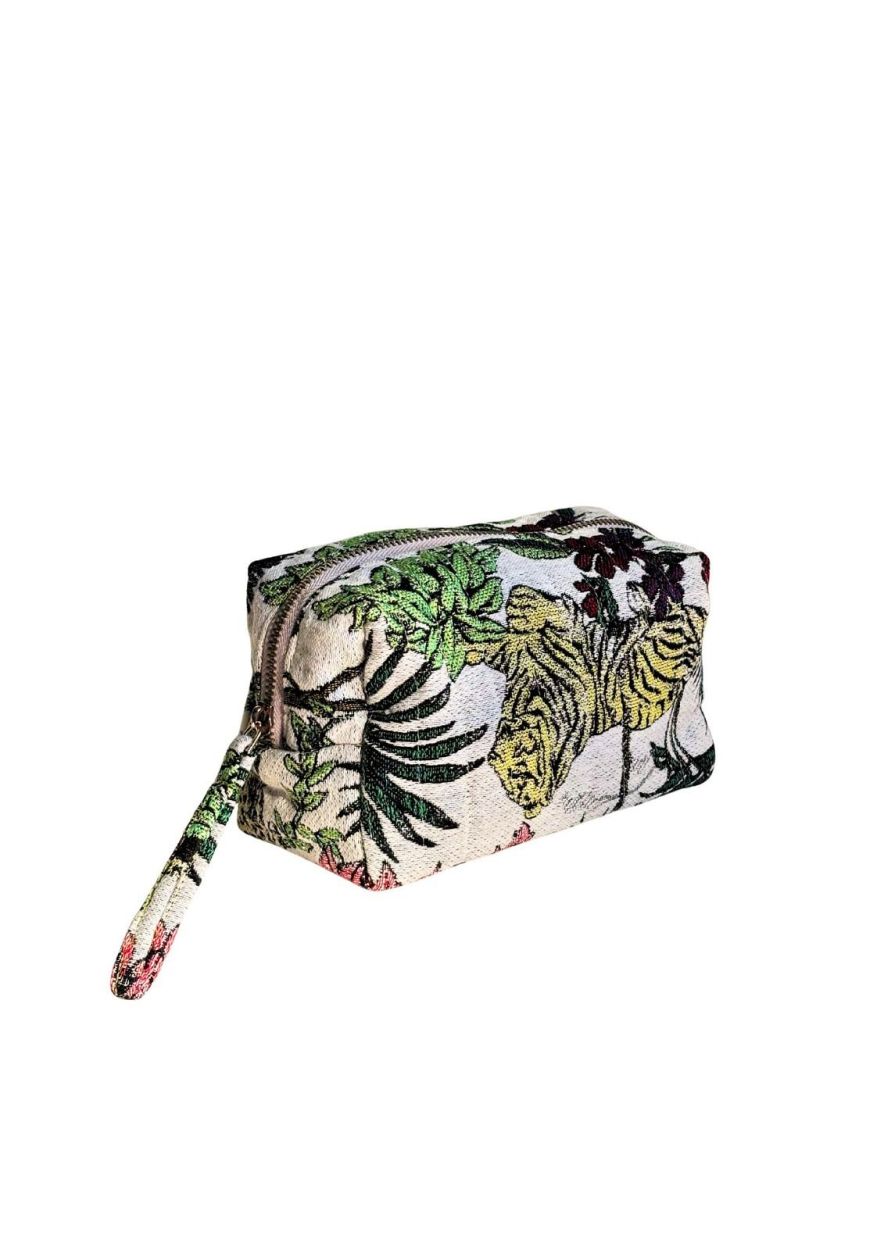 La trousse est réalisée en jacquard épais et de très haute qualité, solide au toucher et qui garde parfaitement sa forme. Le tissu est résistant, élégant et adapté à un usage intensif, à la maison comme en voyage.