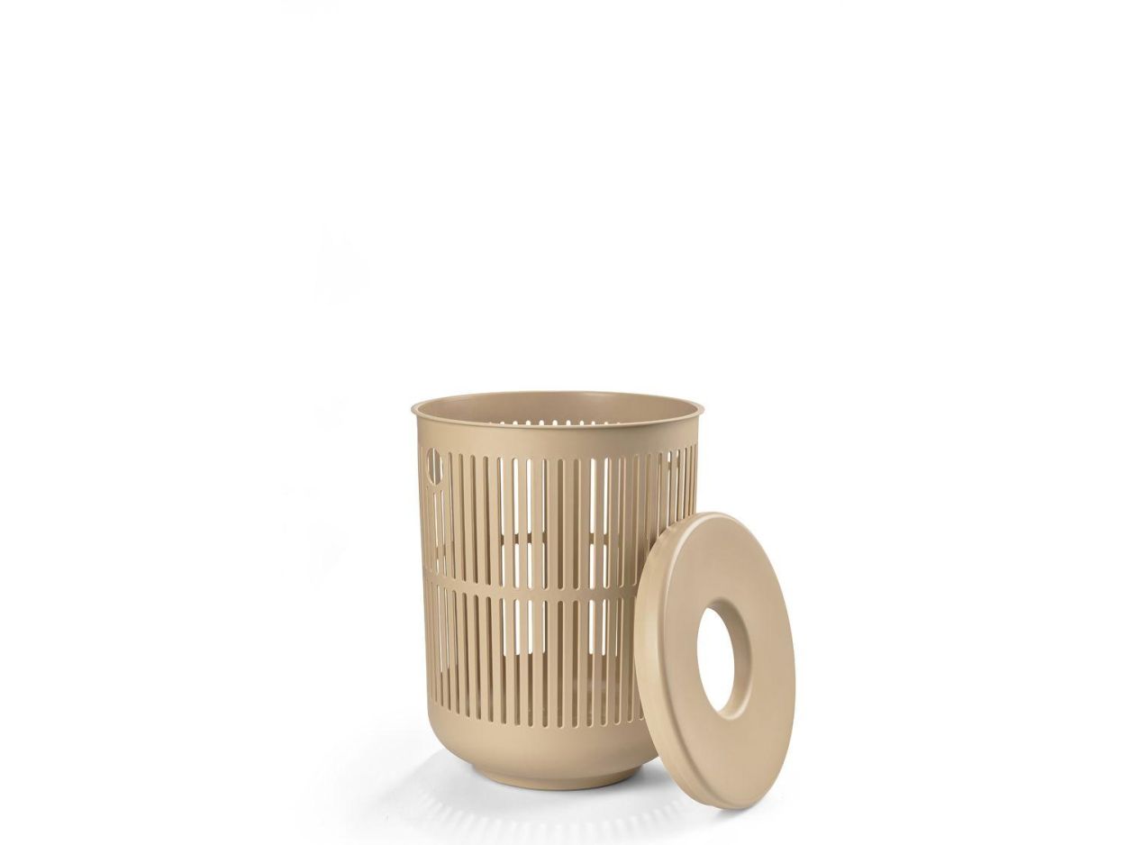 Son couvercle se soulève facilement, mais il n’est pas toujours nécessaire de l’ouvrir : une ouverture centrale permet d’y glisser directement de petits vêtements comme des chaussettes. Deux poignées discrètes sur les côtés facilitent le transport.