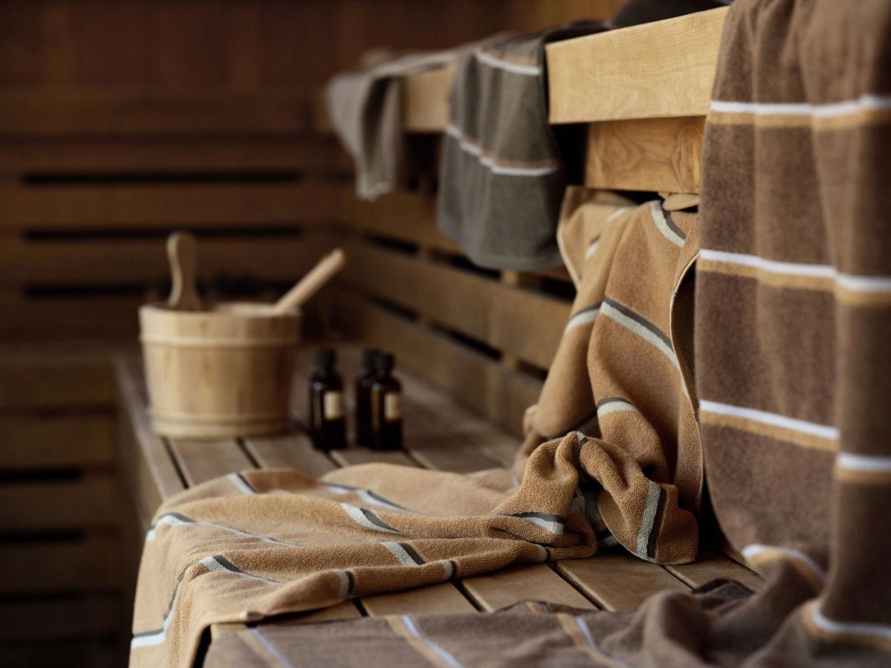 La serviette Sauna associe design graphique et confort luxueux. Inspiré des lignes épurées des intérieurs de sauna en bois, le motif rayé joue subtilement avec la perspective et l’équilibre des couleurs. Chaque face présente une couleur dominante différente, offrant ainsi deux styles en une seule serviette.