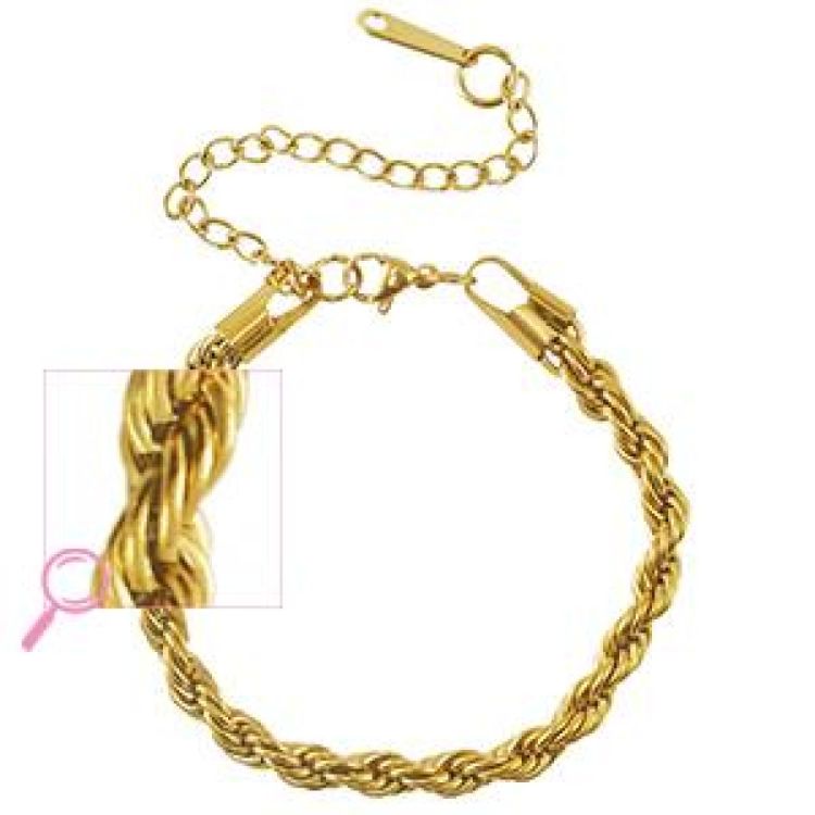 Strakke armband met een fijne twisted structuur. Gemaakt van roestvrij staal (RVS), dus stevig en makkelijk in onderhoud. Met een lengte van ca. 23,5 cm en een verlengketting van 6,5 cm pas je hem eenvoudig aan.