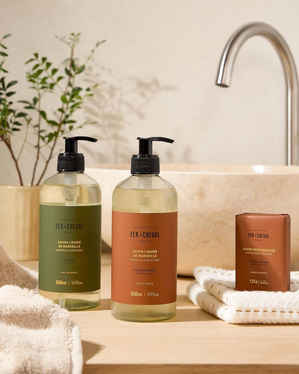 De Savon Doux van Fer à Cheval wordt vervaardigd op basis van authentieke Marseillezeep, verrijkt met plantaardige oliën die bekendstaan om hun verzorgende en verzachtende eigenschappen. Deze zachte, milde formule met 97% ingrediënten van natuurlijke oorsprong reinigt de huid zonder uit te drogen en is geschikt voor iedere dag en alle huidtypes.