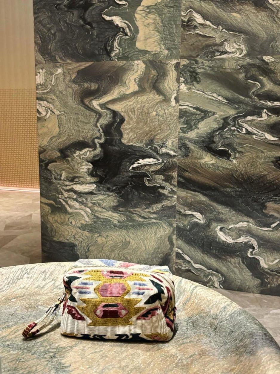 Deze toilettas van Khus is ontworpen als een luxe en duurzaam accessoire met een uniek karakter. De stof is volledig door founder Julot Vonk zelf ontworpen. Door de manier waarop de patronen worden geplaatst en gesneden, is geen enkele toilettas precies hetzelfde — elk exemplaar is echt one of a kind.