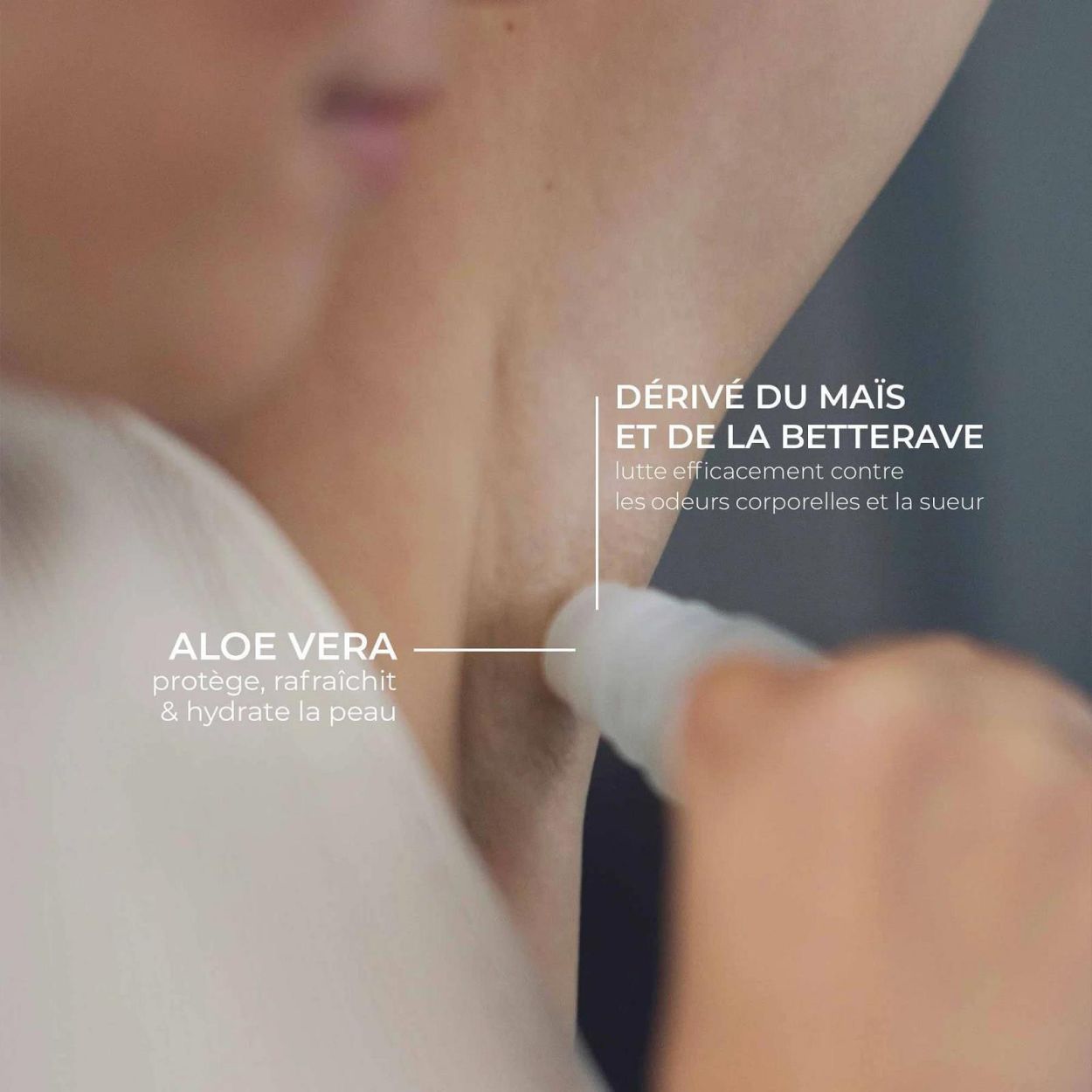 Hydraterende aloë vera en voedende biologische zonnebloemolie verzorgen de huid, terwijl plantaardige actieve stoffen uit maïs en rode biet op natuurlijke wijze zweetgeurtjes tegengaan. Het subtiele parfum van mimosa en ceder is genderneutraal en cocooning – fris, warm en elegant.