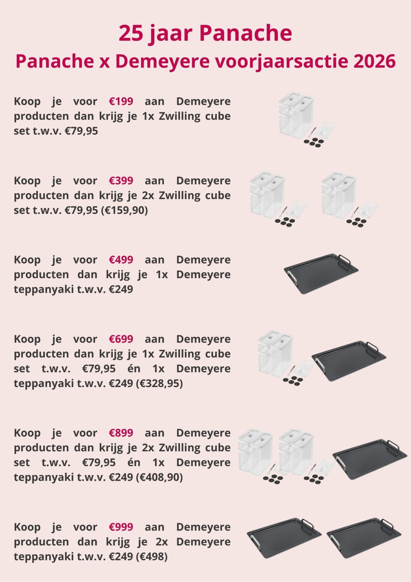 Vier 25 jaar Panache met ons mee. Een jubileum vier je niet alleen. Daarom hebben we samen met Demeyere dit voorjaar iets extra voor jou. Geniet van onze voorjaarspromoties tot en met 31 mei én exclusief bij Panache: