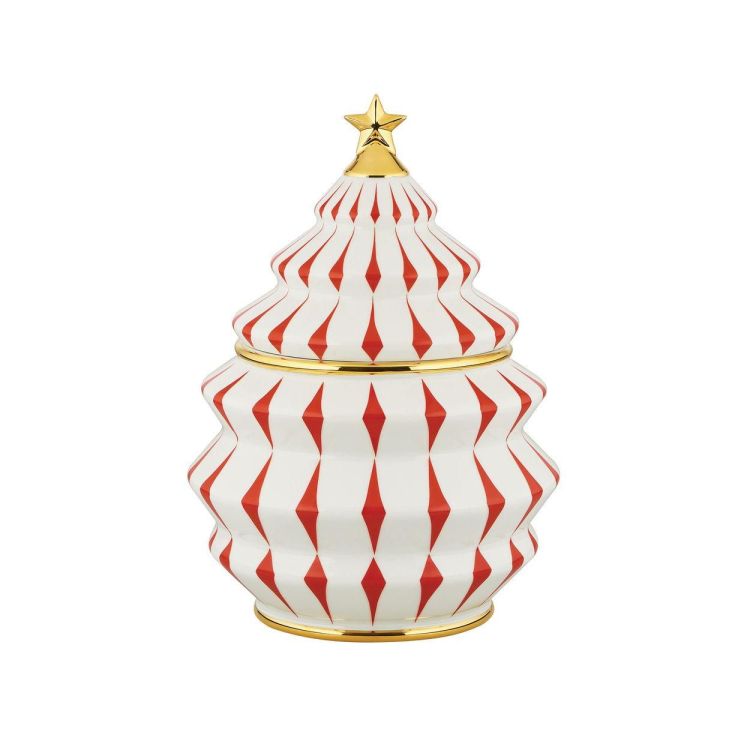 Om kerstkoekjes een passend thuis te geven, heeft Nika Zupanc een koekjespot ontworpen die doet denken aan een met sneeuw bedekte kerstboom. Dit object is duidelijk beïnvloed door Zupanc's kenmerkende ontwerptaal, die traditionele vormen en stilistische kenmerken op een moderne, eigentijdse manier interpreteert. De ontwerper heeft gekozen voor traditionele kerstkleuren: wit voor de achtergrond; rood voor de decoratie op het lichaam; en goud voor de kleine ster, die fungeert als handvat op het deksel, en voor de dunne rand die de onderkant en het punt waar de twee delen van de koekjespot samenkomen, accentueert. Een sfeervol object, een modern sprookje dat de verbeelding prikkelt en vreugde brengt met zijn delicate lijnen en levendige kleuren.