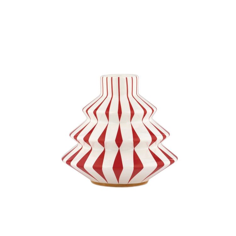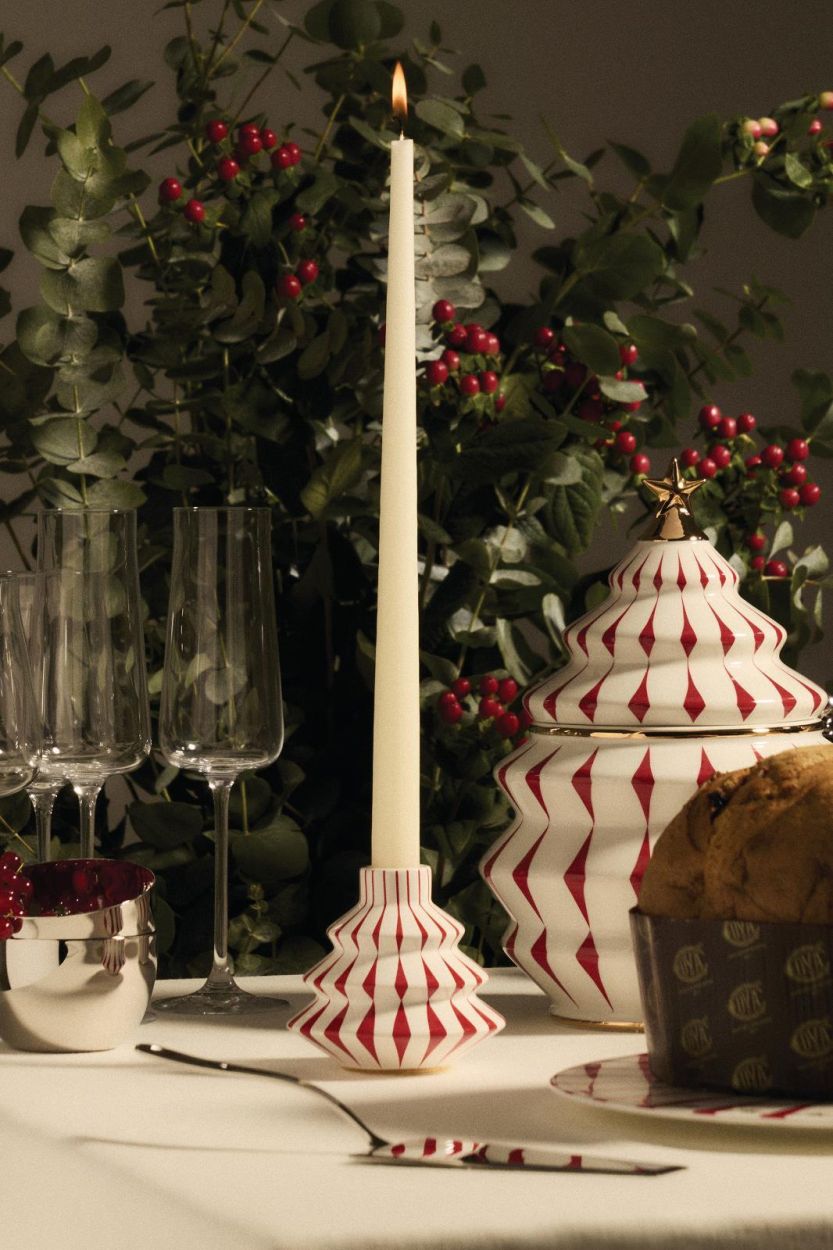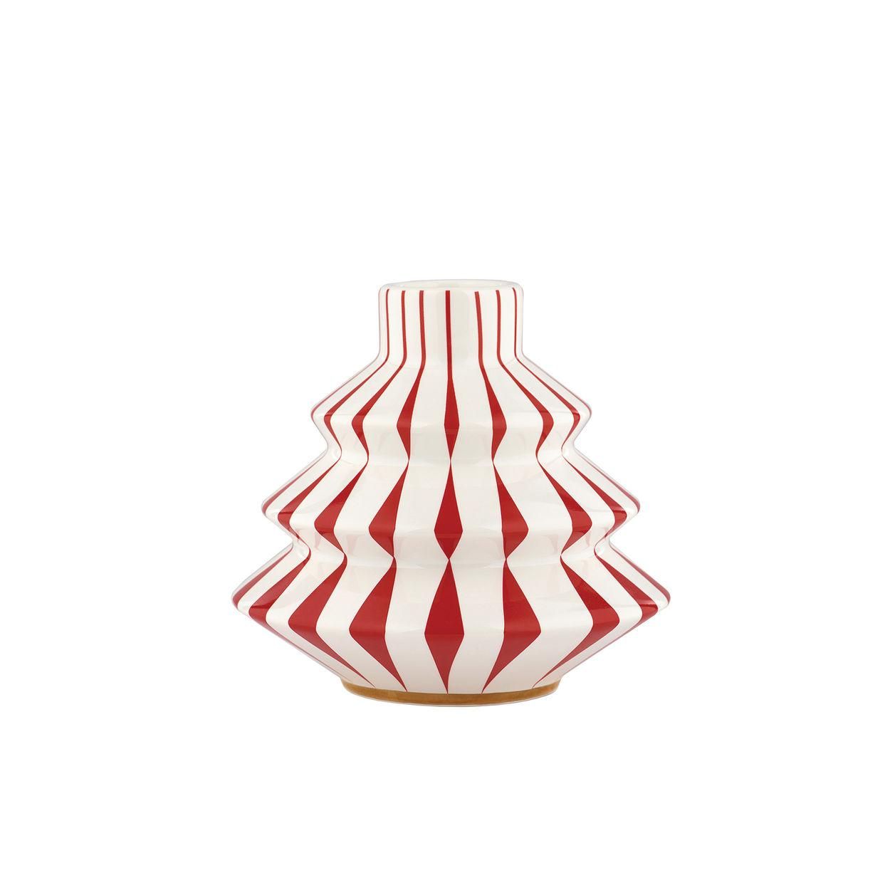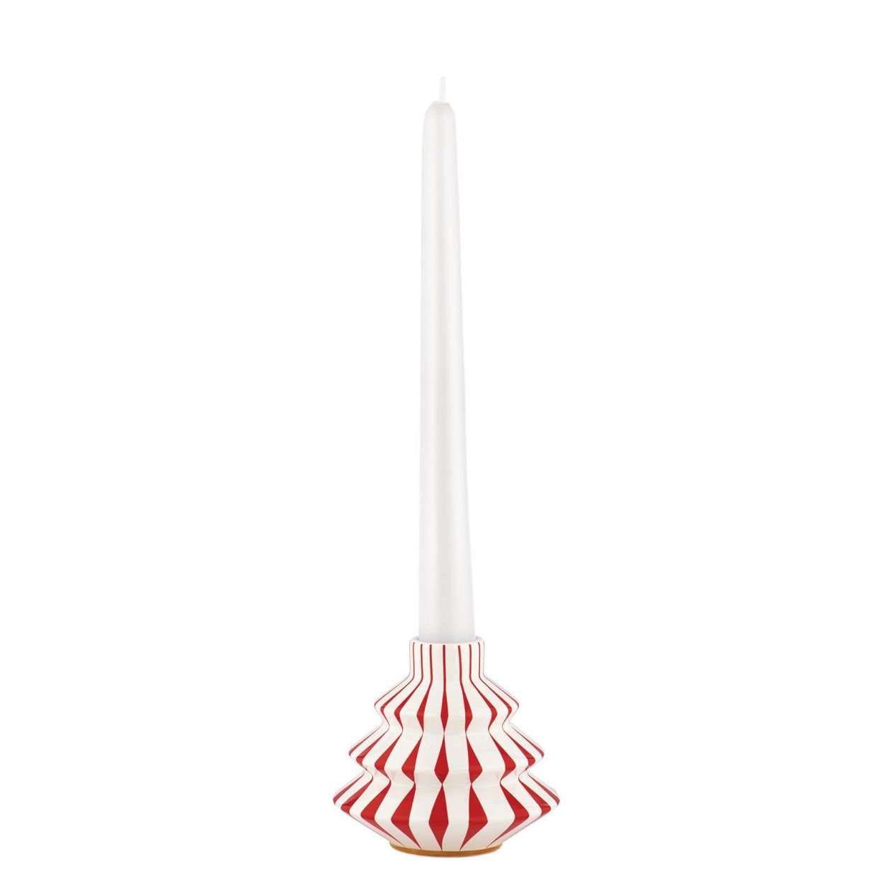 Een porseleinen kandelaar met de vorm van een kleine kerstboom. Het witte oppervlak is versierd met een fijn rood patroon dat zich ritmisch versmalt en verbreedt, eindigend in een elegante gouden ring. Zupanc combineert traditie en eigentijds design in een helder, uitgebalanceerd object.