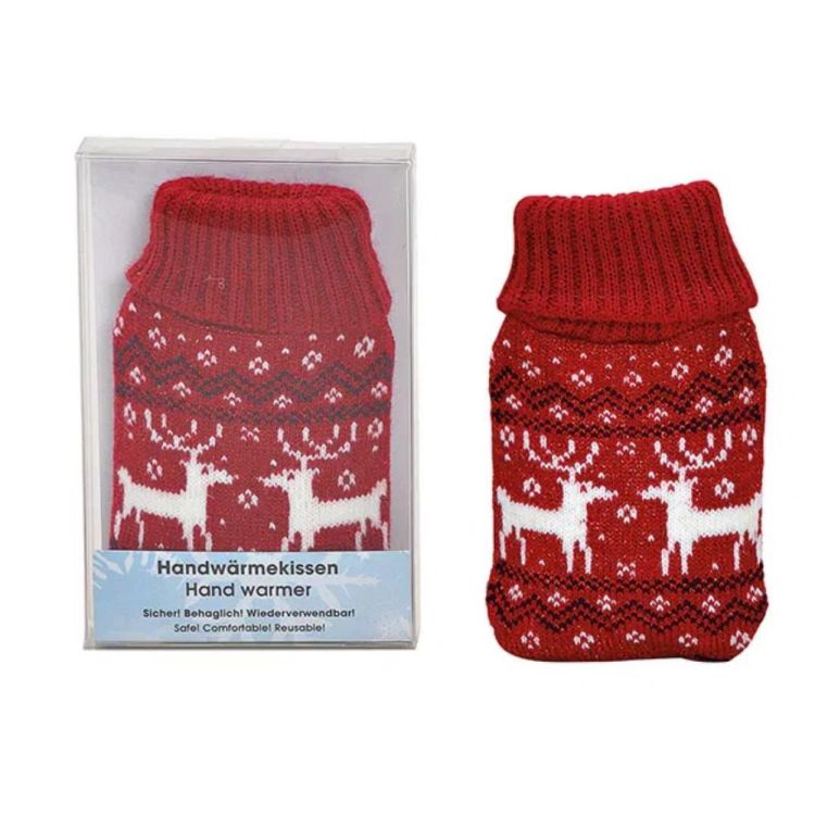 Pocketwarmer in een gebreid hoesje met eland. Veilig, comfortabel en herbruikbaar. Fijn voor koude handen.