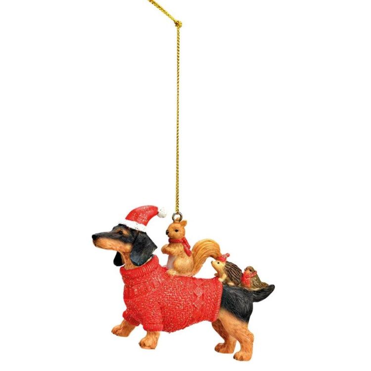 Een teckel vol kerstpret, met kleine vriendjes op zijn rug. Gemaakt van polyresin. Hang ‘m in de boom en je hebt er meteen een extra kerstmaatje bij.