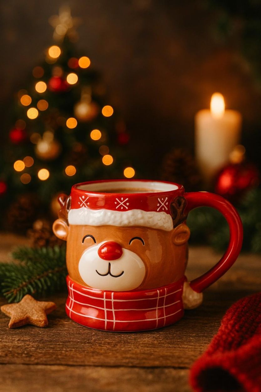 Een rode mok met een 3D rendier erop. Stevig, vrolijk en perfect voor warme choco op koude dagen.