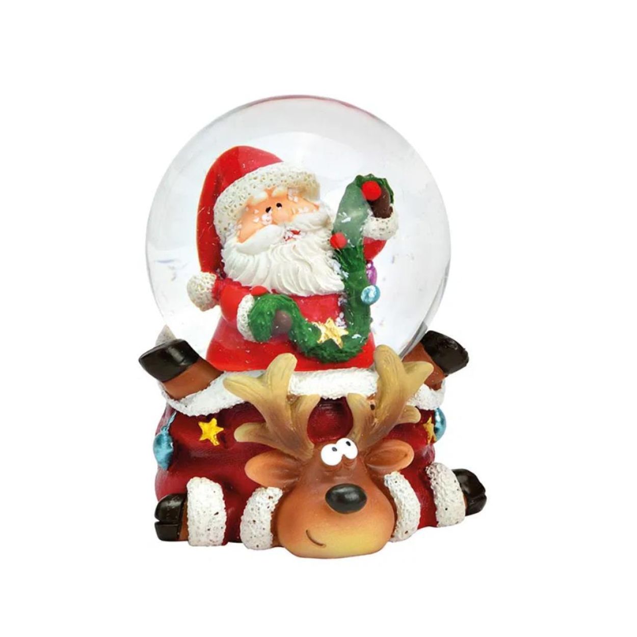 Kleine sneeuwbol met de Kerstman op een eland. Glas en poly. Even schudden, en het sneeuwt gezellig.