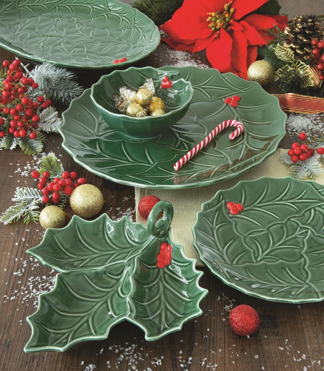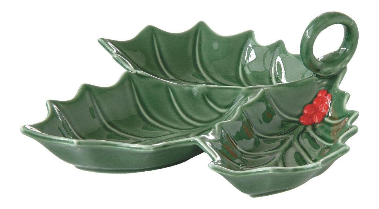 Porseleinen aperitiefschaal van 22 x 20 cm, in de vorm van een hulstblad. Voorzien van drie onderverdelingen en een handig handvat in het midden.