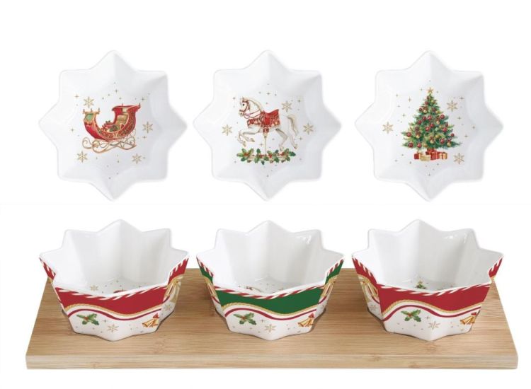 Drie porseleinen kommetjes op een elegant bamboe dienblad met handvat, klaar voor elk feestmoment. Perfect voor nootjes, dips, olijven of kleine hapjes tijdens de feestdagen.