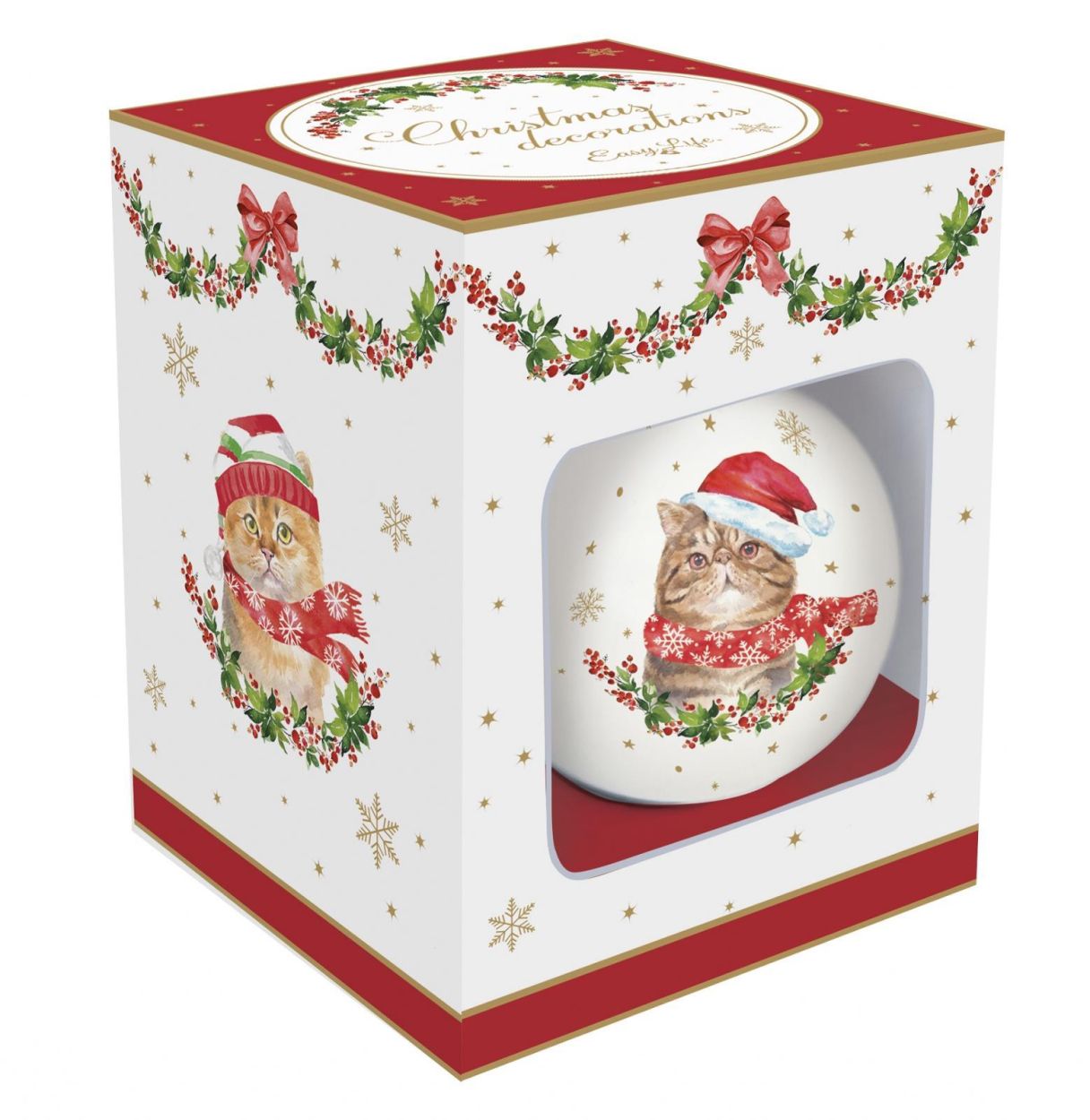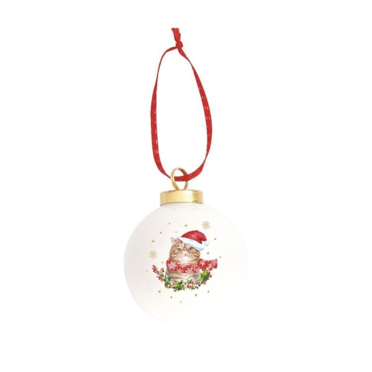 Kerstbal van keramiek met een Kerst kat, diameter 7 cm.