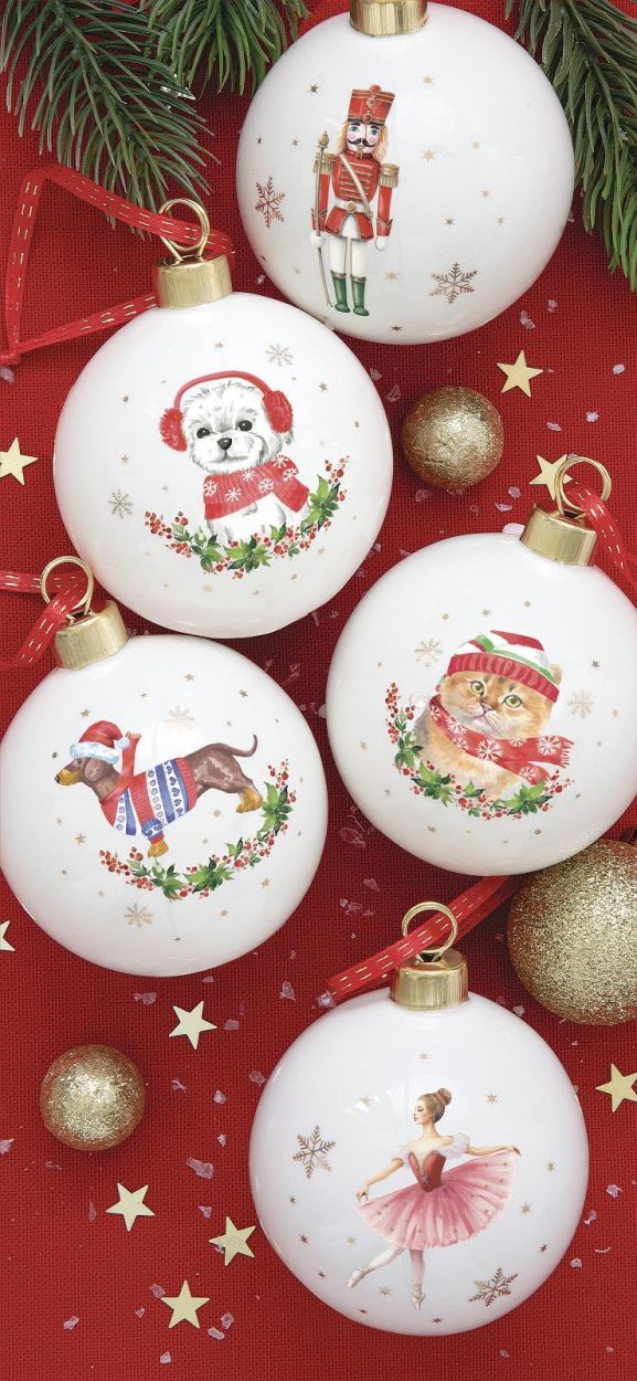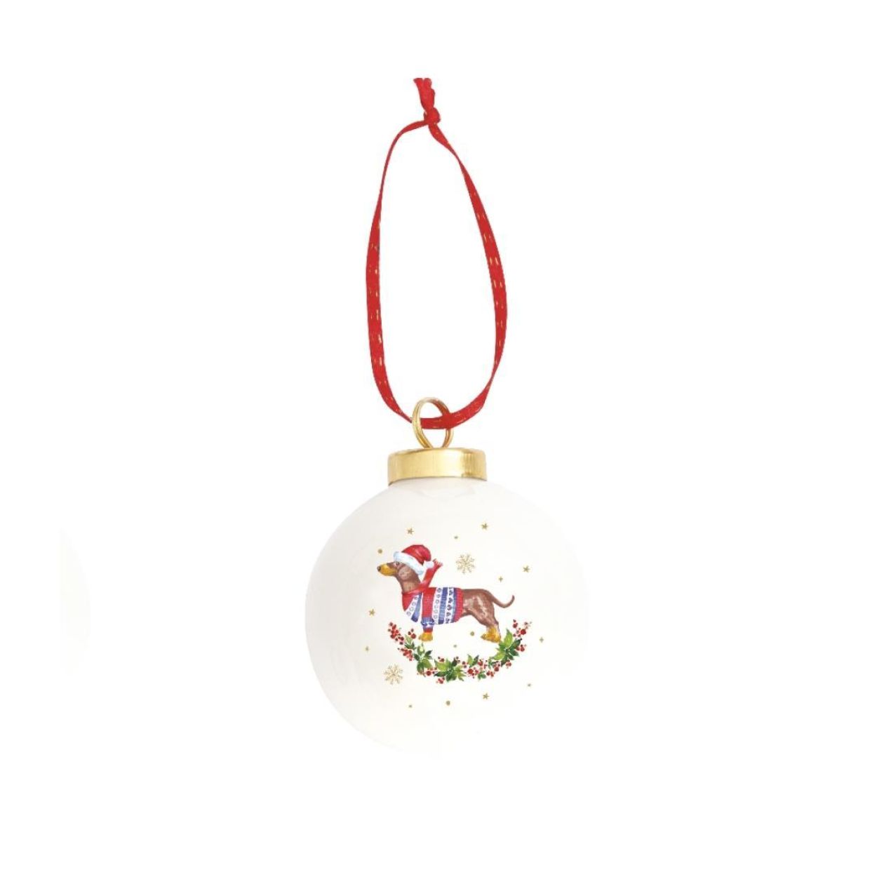 Deze keramieken kerstbal van 7 cm toont een speelse teckel in winterse outfit. Compact, licht en ideaal om op te hangen zonder je takken te overbelasten.